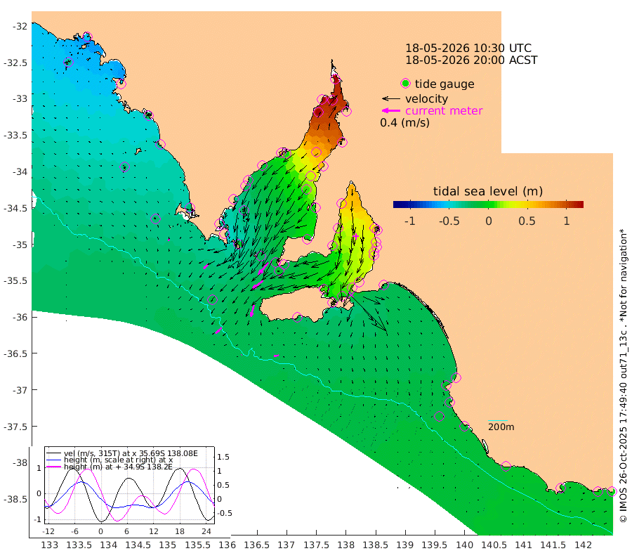 1cm/s -121T +10cm/s rms + 5cm/s 114T. SAM1DS 520m 13cm/s -133T +13cm/s rms + 5cm/s -36T. SAM2CP 100m 13cm/s -137T +21cm/s rms + 18cm/s 142T. SAM3MS 168m 11cm/s -98T +22cm/s rms + 0cm/s -30T. SAM4CY 117m 3cm/s 164T +23cm/s rms + 2cm/s 99T. SAM5CB 94m 29cm/s -128T +8cm/s rms + 3cm/s -172T. SAM6IS 83m 6cm/s -140T +11cm/s rms + 7cm/s 150T. SAM7DS 519m 34cm/s -141T +10cm/s rms + 2cm/s 87T. SAM8SG 47m 27cm/s -165T +20cm/s rms + 12cm/s -168T. NRSKAI 101m -3cm Warrnambool -4cm Port Fairy -7cm Portland -6cm Port Macdonnell -12cm Beachport -12cm Cape Rabelais (off) -12cm Robe -11cm Cape Jaffa -11cm Kingston -15cm Victor Harbor -22cm Vivonne Bay 11cm Kingscote 19cm American River -1cm Penneshaw 14cm Cape Jervis 30cm Second Valley 31cm Port Noarlunga 31cm Port Stanvac 33cm Brighton 32cm Glenelg 40cm Port Adelaide (Outer Harbor) 74cm Angus Inlet (Garden Island) 41cm Ardrossan 15cm Port Vincent 13cm Port Giles -19cm Stenhouse Bay -9cm Althorpe Island -12cm Pondalowie Bay 0cm Point Turton 0cm Port Victoria 9cm Cape Elizabeth 26cm Tiparra Reef Light 59cm Wallaroo 64cm Middle Bank 87cm Port Broughton 165cm Port Pirie 184cm Red Cliff Point (Beacon 5) 148cm Port Bonython 146cm Whyalla 130cm Western Shoal Beacon 48cm Franklin Harbor 6cm Franklin Harbor Entrance Beacon -13cm Arno Bay -22cm Port Neill -24cm Cape Hardy -30cm Tumby Bay -26cm Reevesby Island -37cm Port Lincoln -35cm Taylors Landing -10cm Whalers Bay -21cm Wedge Island Mooring -18cm Shelf Edge Mooring -30cm Coffin Bay Entrance Beacon -26cm Greenly Island -34cm Elliston -33cm Pearson Island -21cm Venus Bay -52cm Blanche Port (Streaky Bay) -54cm Thevenard -36cm St Francis Island
