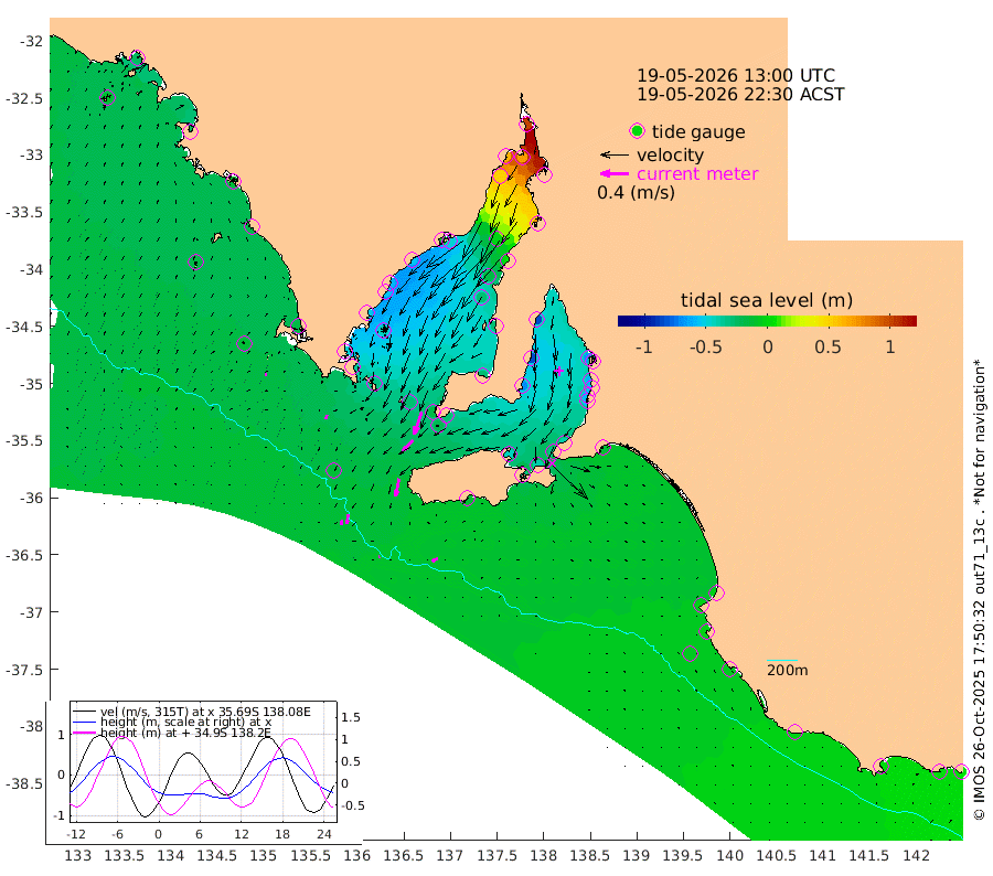 1cm/s -99T +10cm/s rms + 5cm/s 114T. SAM1DS 520m 5cm/s -170T +13cm/s rms + 5cm/s -36T. SAM2CP 100m 13cm/s -171T +21cm/s rms + 18cm/s 142T. SAM3MS 168m 9cm/s -120T +22cm/s rms + 0cm/s -30T. SAM4CY 117m 2cm/s 70T +23cm/s rms + 2cm/s 99T. SAM5CB 94m 21cm/s -134T +8cm/s rms + 3cm/s -172T. SAM6IS 83m 6cm/s -169T +11cm/s rms + 7cm/s 150T. SAM7DS 519m 33cm/s -161T +10cm/s rms + 2cm/s 87T. SAM8SG 47m 25cm/s -169T +20cm/s rms + 12cm/s -168T. NRSKAI 101m 4cm Warrnambool 2cm Port Fairy 1cm Portland -2cm Port Macdonnell -5cm Beachport -4cm Cape Rabelais (off) -3cm Robe -3cm Cape Jaffa -3cm Kingston -13cm Victor Harbor -12cm Vivonne Bay -44cm Kingscote -31cm American River -40cm Penneshaw -33cm Cape Jervis -40cm Second Valley -56cm Port Noarlunga -58cm Port Stanvac -59cm Brighton -63cm Glenelg -65cm Port Adelaide (Outer Harbor) -37cm Angus Inlet (Garden Island) -85cm Ardrossan -83cm Port Vincent -70cm Port Giles -29cm Stenhouse Bay -22cm Althorpe Island -18cm Pondalowie Bay -28cm Point Turton -29cm Port Victoria -28cm Cape Elizabeth -17cm Tiparra Reef Light 5cm Wallaroo 0cm Middle Bank 74cm Port Broughton 96cm Port Pirie 99cm Red Cliff Point (Beacon 5) 69cm Port Bonython 62cm Whyalla 50cm Western Shoal Beacon -13cm Franklin Harbor -49cm Franklin Harbor Entrance Beacon -53cm Arno Bay -59cm Port Neill -53cm Cape Hardy -52cm Tumby Bay -45cm Reevesby Island -46cm Port Lincoln -35cm Taylors Landing -31cm Whalers Bay -27cm Wedge Island Mooring -12cm Shelf Edge Mooring -18cm Coffin Bay Entrance Beacon -15cm Greenly Island -18cm Elliston -16cm Pearson Island -12cm Venus Bay -24cm Blanche Port (Streaky Bay) -25cm Thevenard -10cm St Francis Island