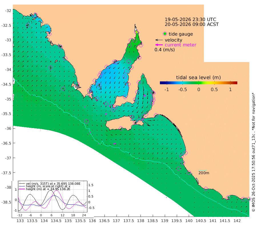 2cm/s 114T +10cm/s rms + 5cm/s 114T. SAM1DS 520m 3cm/s 50T +13cm/s rms + 5cm/s -36T. SAM2CP 100m 4cm/s 21T +21cm/s rms + 18cm/s 142T. SAM3MS 168m 13cm/s 79T +22cm/s rms + 0cm/s -30T. SAM4CY 117m 3cm/s 50T +23cm/s rms + 2cm/s 99T. SAM5CB 94m 9cm/s -112T +8cm/s rms + 3cm/s -172T. SAM6IS 83m 2cm/s -12T +11cm/s rms + 7cm/s 150T. SAM7DS 519m 5cm/s 24T +10cm/s rms + 2cm/s 87T. SAM8SG 47m 1cm/s -140T +20cm/s rms + 12cm/s -168T. NRSKAI 101m -26cm Warrnambool -24cm Port Fairy -25cm Portland -29cm Port Macdonnell -22cm Beachport -25cm Cape Rabelais (off) -28cm Robe -33cm Cape Jaffa -31cm Kingston -27cm Victor Harbor -15cm Vivonne Bay -35cm Kingscote -30cm American River -34cm Penneshaw -26cm Cape Jervis -27cm Second Valley -30cm Port Noarlunga -31cm Port Stanvac -30cm Brighton -34cm Glenelg -30cm Port Adelaide (Outer Harbor) -11cm Angus Inlet (Garden Island) -33cm Ardrossan -45cm Port Vincent -41cm Port Giles -38cm Stenhouse Bay -39cm Althorpe Island -37cm Pondalowie Bay -53cm Point Turton -52cm Port Victoria -49cm Cape Elizabeth -48cm Tiparra Reef Light -40cm Wallaroo -35cm Middle Bank -45cm Port Broughton 1cm Port Pirie 20cm Red Cliff Point (Beacon 5) 4cm Port Bonython -4cm Whyalla -11cm Western Shoal Beacon -44cm Franklin Harbor -48cm Franklin Harbor Entrance Beacon -49cm Arno Bay -57cm Port Neill -51cm Cape Hardy -49cm Tumby Bay -44cm Reevesby Island -45cm Port Lincoln -35cm Taylors Landing -46cm Whalers Bay -37cm Wedge Island Mooring -22cm Shelf Edge Mooring -33cm Coffin Bay Entrance Beacon -21cm Greenly Island -33cm Elliston -25cm Pearson Island -36cm Venus Bay -49cm Blanche Port (Streaky Bay) -43cm Thevenard -29cm St Francis Island