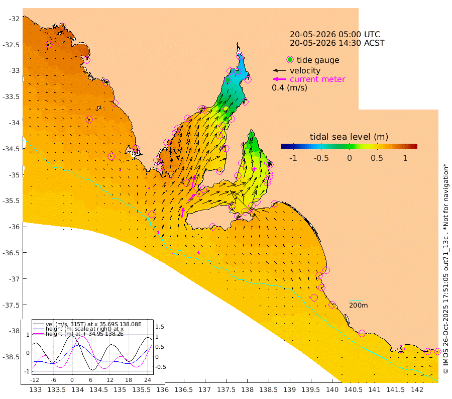 1cm/s -14T +10cm/s rms + 5cm/s 114T. SAM1DS 520m 6cm/s 14T +13cm/s rms + 5cm/s -36T. SAM2CP 100m 11cm/s -6T +21cm/s rms + 18cm/s 142T. SAM3MS 168m 9cm/s -27T +22cm/s rms + 0cm/s -30T. SAM4CY 117m 4cm/s -52T +23cm/s rms + 2cm/s 99T. SAM5CB 94m 28cm/s 46T +8cm/s rms + 3cm/s -172T. SAM6IS 83m 5cm/s -3T +11cm/s rms + 7cm/s 150T. SAM7DS 519m 39cm/s 13T +10cm/s rms + 2cm/s 87T. SAM8SG 47m 32cm/s 11T +20cm/s rms + 12cm/s -168T. NRSKAI 101m 53cm Warrnambool 51cm Port Fairy 53cm Portland 52cm Port Macdonnell 53cm Beachport 55cm Cape Rabelais (off) 54cm Robe 58cm Cape Jaffa 56cm Kingston 60cm Victor Harbor 54cm Vivonne Bay 43cm Kingscote 33cm American River 51cm Penneshaw 34cm Cape Jervis 28cm Second Valley 25cm Port Noarlunga 25cm Port Stanvac 23cm Brighton 24cm Glenelg 18cm Port Adelaide (Outer Harbor) -12cm Angus Inlet (Garden Island) 17cm Ardrossan 35cm Port Vincent 40cm Port Giles 58cm Stenhouse Bay 58cm Althorpe Island 51cm Pondalowie Bay 61cm Point Turton 55cm Port Victoria 55cm Cape Elizabeth 49cm Tiparra Reef Light 29cm Wallaroo 30cm Middle Bank -23cm Port Broughton -41cm Port Pirie -54cm Red Cliff Point (Beacon 5) -32cm Port Bonython -23cm Whyalla -14cm Western Shoal Beacon 34cm Franklin Harbor 70cm Franklin Harbor Entrance Beacon 75cm Arno Bay 86cm Port Neill 83cm Cape Hardy 85cm Tumby Bay 77cm Reevesby Island 83cm Port Lincoln 74cm Taylors Landing 61cm Whalers Bay 65cm Wedge Island Mooring 56cm Shelf Edge Mooring 68cm Coffin Bay Entrance Beacon 59cm Greenly Island 69cm Elliston 61cm Pearson Island 54cm Venus Bay 87cm Blanche Port (Streaky Bay) 84cm Thevenard 68cm St Francis Island
