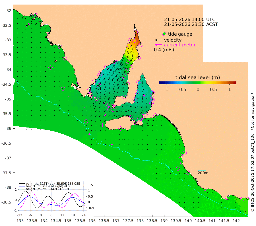 1cm/s -94T +10cm/s rms + 5cm/s 114T. SAM1DS 520m 4cm/s -166T +13cm/s rms + 5cm/s -36T. SAM2CP 100m 10cm/s -168T +21cm/s rms + 18cm/s 142T. SAM3MS 168m 9cm/s -113T +22cm/s rms + 0cm/s -30T. SAM4CY 117m 1cm/s 86T +23cm/s rms + 2cm/s 99T. SAM5CB 94m 15cm/s -132T +8cm/s rms + 3cm/s -172T. SAM6IS 83m 5cm/s -170T +11cm/s rms + 7cm/s 150T. SAM7DS 519m 24cm/s -159T +10cm/s rms + 2cm/s 87T. SAM8SG 47m 18cm/s -169T +20cm/s rms + 12cm/s -168T. NRSKAI 101m 10cm Warrnambool 8cm Port Fairy 7cm Portland 4cm Port Macdonnell 2cm Beachport 3cm Cape Rabelais (off) 4cm Robe 5cm Cape Jaffa 3cm Kingston -4cm Victor Harbor -5cm Vivonne Bay -27cm Kingscote -18cm American River -25cm Penneshaw -20cm Cape Jervis -28cm Second Valley -39cm Port Noarlunga -40cm Port Stanvac -40cm Brighton -43cm Glenelg -45cm Port Adelaide (Outer Harbor) -24cm Angus Inlet (Garden Island) -61cm Ardrossan -59cm Port Vincent -48cm Port Giles -15cm Stenhouse Bay -10cm Althorpe Island -6cm Pondalowie Bay -12cm Point Turton -10cm Port Victoria -12cm Cape Elizabeth -4cm Tiparra Reef Light 14cm Wallaroo 10cm Middle Bank 64cm Port Broughton 80cm Port Pirie 77cm Red Cliff Point (Beacon 5) 59cm Port Bonython 54cm Whyalla 44cm Western Shoal Beacon -1cm Franklin Harbor -27cm Franklin Harbor Entrance Beacon -30cm Arno Bay -35cm Port Neill -31cm Cape Hardy -31cm Tumby Bay -25cm Reevesby Island -25cm Port Lincoln -19cm Taylors Landing -14cm Whalers Bay -13cm Wedge Island Mooring -4cm Shelf Edge Mooring -6cm Coffin Bay Entrance Beacon -4cm Greenly Island -6cm Elliston -5cm Pearson Island -2cm Venus Bay -8cm Blanche Port (Streaky Bay) -9cm Thevenard 1cm St Francis Island