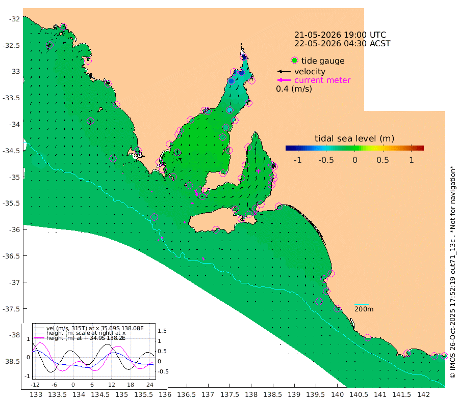 0cm/s 37T +10cm/s rms + 5cm/s 114T. SAM1DS 520m 4cm/s 99T +13cm/s rms + 5cm/s -36T. SAM2CP 100m 7cm/s 116T +21cm/s rms + 18cm/s 142T. SAM3MS 168m 9cm/s 150T +22cm/s rms + 0cm/s -30T. SAM4CY 117m 2cm/s 163T +23cm/s rms + 2cm/s 99T. SAM5CB 94m 7cm/s 97T +8cm/s rms + 3cm/s -172T. SAM6IS 83m 3cm/s 112T +11cm/s rms + 7cm/s 150T. SAM7DS 519m 19cm/s 158T +10cm/s rms + 2cm/s 87T. SAM8SG 47m 8cm/s 176T +20cm/s rms + 12cm/s -168T. NRSKAI 101m -30cm Warrnambool -29cm Port Fairy -28cm Portland -26cm Port Macdonnell -27cm Beachport -27cm Cape Rabelais (off) -24cm Robe -27cm Cape Jaffa -26cm Kingston -28cm Victor Harbor -25cm Vivonne Bay -19cm Kingscote -22cm American River -19cm Penneshaw -21cm Cape Jervis -23cm Second Valley -16cm Port Noarlunga -16cm Port Stanvac -17cm Brighton -14cm Glenelg -15cm Port Adelaide (Outer Harbor) -29cm Angus Inlet (Garden Island) -8cm Ardrossan -5cm Port Vincent -9cm Port Giles -13cm Stenhouse Bay -22cm Althorpe Island -16cm Pondalowie Bay -20cm Point Turton -20cm Port Victoria -26cm Cape Elizabeth -31cm Tiparra Reef Light -45cm Wallaroo -52cm Middle Bank -25cm Port Broughton -94cm Port Pirie -109cm Red Cliff Point (Beacon 5) -88cm Port Bonython -88cm Whyalla -80cm Western Shoal Beacon -36cm Franklin Harbor -35cm Franklin Harbor Entrance Beacon -26cm Arno Bay -23cm Port Neill -24cm Cape Hardy -23cm Tumby Bay -22cm Reevesby Island -19cm Port Lincoln -21cm Taylors Landing -18cm Whalers Bay -22cm Wedge Island Mooring -27cm Shelf Edge Mooring -25cm Coffin Bay Entrance Beacon -25cm Greenly Island -24cm Elliston -21cm Pearson Island -16cm Venus Bay -20cm Blanche Port (Streaky Bay) -20cm Thevenard -22cm St Francis Island