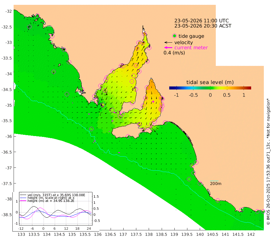 1cm/s -76T +10cm/s rms + 5cm/s 114T. SAM1DS 520m 6cm/s -116T +13cm/s rms + 5cm/s -36T. SAM2CP 100m 7cm/s -99T +21cm/s rms + 18cm/s 142T. SAM3MS 168m 8cm/s -74T +22cm/s rms + 0cm/s -30T. SAM4CY 117m 1cm/s -138T +23cm/s rms + 2cm/s 99T. SAM5CB 94m 8cm/s -111T +8cm/s rms + 3cm/s -172T. SAM6IS 83m 2cm/s -110T +11cm/s rms + 7cm/s 150T. SAM7DS 519m 9cm/s -72T +10cm/s rms + 2cm/s 87T. SAM8SG 47m 2cm/s -134T +20cm/s rms + 12cm/s -168T. NRSKAI 101m 3cm Warrnambool 5cm Port Fairy 5cm Portland 11cm Port Macdonnell 7cm Beachport 8cm Cape Rabelais (off) 6cm Robe 11cm Cape Jaffa 9cm Kingston 11cm Victor Harbor 4cm Vivonne Bay 37cm Kingscote 37cm American River 30cm Penneshaw 32cm Cape Jervis 46cm Second Valley 52cm Port Noarlunga 53cm Port Stanvac 55cm Brighton 56cm Glenelg 60cm Port Adelaide (Outer Harbor) 64cm Angus Inlet (Garden Island) 67cm Ardrossan 64cm Port Vincent 49cm Port Giles 15cm Stenhouse Bay 18cm Althorpe Island 16cm Pondalowie Bay 27cm Point Turton 31cm Port Victoria 38cm Cape Elizabeth 34cm Tiparra Reef Light 45cm Wallaroo 50cm Middle Bank 37cm Port Broughton 66cm Port Pirie 73cm Red Cliff Point (Beacon 5) 66cm Port Bonython 68cm Whyalla 62cm Western Shoal Beacon 47cm Franklin Harbor 40cm Franklin Harbor Entrance Beacon 32cm Arno Bay 29cm Port Neill 26cm Cape Hardy 24cm Tumby Bay 19cm Reevesby Island 15cm Port Lincoln 12cm Taylors Landing 23cm Whalers Bay 16cm Wedge Island Mooring 10cm Shelf Edge Mooring 9cm Coffin Bay Entrance Beacon 7cm Greenly Island 9cm Elliston 8cm Pearson Island 9cm Venus Bay 7cm Blanche Port (Streaky Bay) 4cm Thevenard -4cm St Francis Island