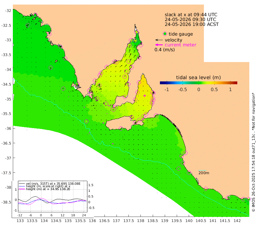 1cm/s -53T +10cm/s rms + 5cm/s 114T. SAM1DS 520m 3cm/s -104T +13cm/s rms + 5cm/s -36T. SAM2CP 100m 4cm/s -65T +21cm/s rms + 18cm/s 142T. SAM3MS 168m 6cm/s -63T +22cm/s rms + 0cm/s -30T. SAM4CY 117m 1cm/s -129T +23cm/s rms + 2cm/s 99T. SAM5CB 94m 2cm/s 19T +8cm/s rms + 3cm/s -172T. SAM6IS 83m 2cm/s -62T +11cm/s rms + 7cm/s 150T. SAM7DS 519m 7cm/s -24T +10cm/s rms + 2cm/s 87T. SAM8SG 47m 5cm/s -1T +20cm/s rms + 12cm/s -168T. NRSKAI 101m 9cm Warrnambool 10cm Port Fairy 9cm Portland 15cm Port Macdonnell 10cm Beachport 11cm Cape Rabelais (off) 9cm Robe 14cm Cape Jaffa 14cm Kingston 14cm Victor Harbor 8cm Vivonne Bay 27cm Kingscote 25cm American River 25cm Penneshaw 22cm Cape Jervis 33cm Second Valley 34cm Port Noarlunga 34cm Port Stanvac 35cm Brighton 36cm Glenelg 37cm Port Adelaide (Outer Harbor) 32cm Angus Inlet (Garden Island) 43cm Ardrossan 44cm Port Vincent 35cm Port Giles 16cm Stenhouse Bay 18cm Althorpe Island 14cm Pondalowie Bay 22cm Point Turton 22cm Port Victoria 29cm Cape Elizabeth 23cm Tiparra Reef Light 25cm Wallaroo 28cm Middle Bank 15cm Port Broughton 22cm Port Pirie 29cm Red Cliff Point (Beacon 5) 24cm Port Bonython 27cm Whyalla 25cm Western Shoal Beacon 31cm Franklin Harbor 31cm Franklin Harbor Entrance Beacon 27cm Arno Bay 30cm Port Neill 26cm Cape Hardy 25cm Tumby Bay 17cm Reevesby Island 18cm Port Lincoln 15cm Taylors Landing 19cm Whalers Bay 16cm Wedge Island Mooring 11cm Shelf Edge Mooring 11cm Coffin Bay Entrance Beacon 8cm Greenly Island 11cm Elliston 9cm Pearson Island 10cm Venus Bay 10cm Blanche Port (Streaky Bay) 7cm Thevenard 3cm St Francis Island