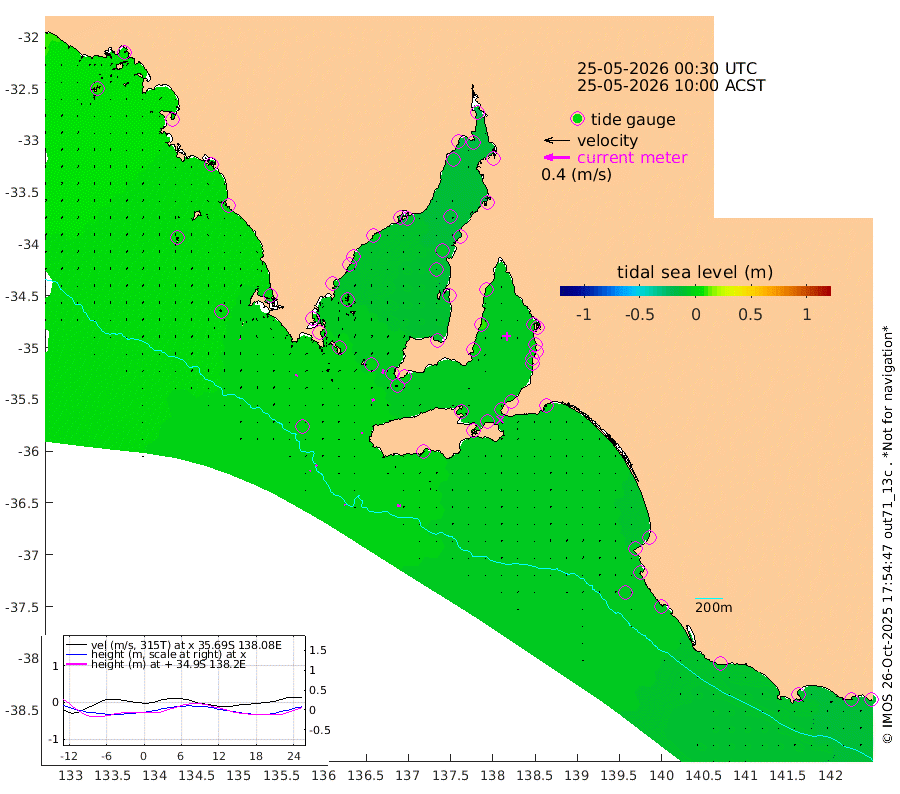 1cm/s 123T +10cm/s rms + 5cm/s 114T. SAM1DS 520m 2cm/s 14T +13cm/s rms + 5cm/s -36T. SAM2CP 100m 3cm/s 53T +21cm/s rms + 18cm/s 142T. SAM3MS 168m 6cm/s 92T +22cm/s rms + 0cm/s -30T. SAM4CY 117m 2cm/s -16T +23cm/s rms + 2cm/s 99T. SAM5CB 94m 4cm/s -116T +8cm/s rms + 3cm/s -172T. SAM6IS 83m 1cm/s 28T +11cm/s rms + 7cm/s 150T. SAM7DS 519m 6cm/s 21T +10cm/s rms + 2cm/s 87T. SAM8SG 47m 2cm/s 16T +20cm/s rms + 12cm/s -168T. NRSKAI 101m -11cm Warrnambool -10cm Port Fairy -8cm Portland -7cm Port Macdonnell -5cm Beachport -6cm Cape Rabelais (off) -5cm Robe -7cm Cape Jaffa -8cm Kingston -3cm Victor Harbor 2cm Vivonne Bay -1cm Kingscote 2cm American River -1cm Penneshaw 1cm Cape Jervis 0cm Second Valley 3cm Port Noarlunga 3cm Port Stanvac 3cm Brighton 1cm Glenelg 4cm Port Adelaide (Outer Harbor) 2cm Angus Inlet (Garden Island) 7cm Ardrossan 9cm Port Vincent 3cm Port Giles -2cm Stenhouse Bay -3cm Althorpe Island -3cm Pondalowie Bay -8cm Point Turton -9cm Port Victoria -9cm Cape Elizabeth -7cm Tiparra Reef Light -11cm Wallaroo -12cm Middle Bank -20cm Port Broughton -20cm Port Pirie -22cm Red Cliff Point (Beacon 5) -18cm Port Bonython -16cm Whyalla -11cm Western Shoal Beacon -14cm Franklin Harbor -8cm Franklin Harbor Entrance Beacon -3cm Arno Bay -7cm Port Neill -1cm Cape Hardy -1cm Tumby Bay 4cm Reevesby Island 0cm Port Lincoln 1cm Taylors Landing -2cm Whalers Bay -2cm Wedge Island Mooring 0cm Shelf Edge Mooring 1cm Coffin Bay Entrance Beacon 1cm Greenly Island 2cm Elliston 5cm Pearson Island 1cm Venus Bay 5cm Blanche Port (Streaky Bay) 7cm Thevenard 9cm St Francis Island
