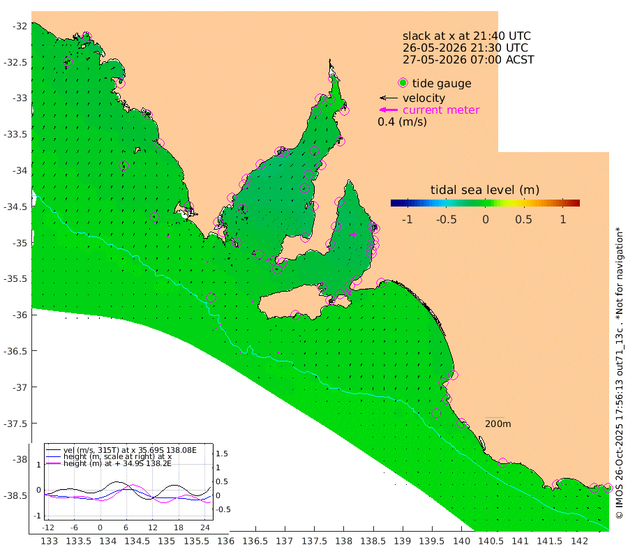 1cm/s 98T +10cm/s rms + 5cm/s 114T. SAM1DS 520m 4cm/s 54T +13cm/s rms + 5cm/s -36T. SAM2CP 100m 1cm/s 37T +21cm/s rms + 18cm/s 142T. SAM3MS 168m 4cm/s 77T +22cm/s rms + 0cm/s -30T. SAM4CY 117m 2cm/s 18T +23cm/s rms + 2cm/s 99T. SAM5CB 94m 1cm/s -120T +8cm/s rms + 3cm/s -172T. SAM6IS 83m 1cm/s -10T +11cm/s rms + 7cm/s 150T. SAM7DS 519m 6cm/s 46T +10cm/s rms + 2cm/s 87T. SAM8SG 47m 3cm/s 19T +20cm/s rms + 12cm/s -168T. NRSKAI 101m 3cm Warrnambool 4cm Port Fairy 4cm Portland 2cm Port Macdonnell 4cm Beachport 2cm Cape Rabelais (off) 2cm Robe -2cm Cape Jaffa -1cm Kingston 0cm Victor Harbor 6cm Vivonne Bay -15cm Kingscote -13cm American River -10cm Penneshaw -11cm Cape Jervis -15cm Second Valley -20cm Port Noarlunga -21cm Port Stanvac -21cm Brighton -22cm Glenelg -23cm Port Adelaide (Outer Harbor) -16cm Angus Inlet (Garden Island) -28cm Ardrossan -28cm Port Vincent -21cm Port Giles -5cm Stenhouse Bay -8cm Althorpe Island -6cm Pondalowie Bay -16cm Point Turton -16cm Port Victoria -19cm Cape Elizabeth -17cm Tiparra Reef Light -16cm Wallaroo -15cm Middle Bank -17cm Port Broughton -3cm Port Pirie -6cm Red Cliff Point (Beacon 5) -2cm Port Bonython -7cm Whyalla -12cm Western Shoal Beacon -18cm Franklin Harbor -19cm Franklin Harbor Entrance Beacon -17cm Arno Bay -20cm Port Neill -19cm Cape Hardy -17cm Tumby Bay -12cm Reevesby Island -9cm Port Lincoln -3cm Taylors Landing -13cm Whalers Bay -5cm Wedge Island Mooring 2cm Shelf Edge Mooring -3cm Coffin Bay Entrance Beacon 3cm Greenly Island -3cm Elliston 2cm Pearson Island -7cm Venus Bay -9cm Blanche Port (Streaky Bay) -6cm Thevenard 2cm St Francis Island