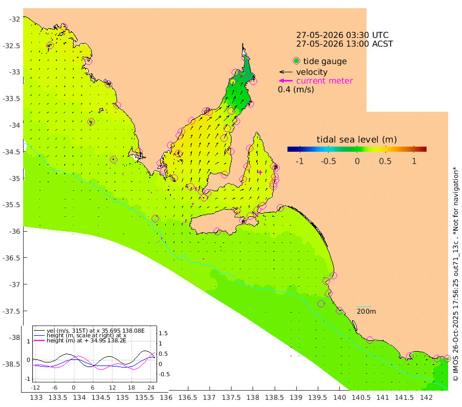 0cm/s 174T +10cm/s rms + 5cm/s 114T. SAM1DS 520m 3cm/s -75T +13cm/s rms + 5cm/s -36T. SAM2CP 100m 4cm/s -15T +21cm/s rms + 18cm/s 142T. SAM3MS 168m 3cm/s -30T +22cm/s rms + 0cm/s -30T. SAM4CY 117m 2cm/s -116T +23cm/s rms + 2cm/s 99T. SAM5CB 94m 5cm/s 37T +8cm/s rms + 3cm/s -172T. SAM6IS 83m 2cm/s -10T +11cm/s rms + 7cm/s 150T. SAM7DS 519m 13cm/s -6T +10cm/s rms + 2cm/s 87T. SAM8SG 47m 8cm/s 7T +20cm/s rms + 12cm/s -168T. NRSKAI 101m 14cm Warrnambool 13cm Port Fairy 14cm Portland 14cm Port Macdonnell 14cm Beachport 14cm Cape Rabelais (off) 16cm Robe 18cm Cape Jaffa 15cm Kingston 20cm Victor Harbor 15cm Vivonne Bay 35cm Kingscote 30cm American River 30cm Penneshaw 29cm Cape Jervis 32cm Second Valley 39cm Port Noarlunga 40cm Port Stanvac 40cm Brighton 40cm Glenelg 42cm Port Adelaide (Outer Harbor) 31cm Angus Inlet (Garden Island) 50cm Ardrossan 48cm Port Vincent 43cm Port Giles 25cm Stenhouse Bay 27cm Althorpe Island 22cm Pondalowie Bay 35cm Point Turton 32cm Port Victoria 33cm Cape Elizabeth 37cm Tiparra Reef Light 32cm Wallaroo 33cm Middle Bank -2cm Port Broughton 5cm Port Pirie 1cm Red Cliff Point (Beacon 5) 6cm Port Bonython 17cm Whyalla 25cm Western Shoal Beacon 34cm Franklin Harbor 46cm Franklin Harbor Entrance Beacon 44cm Arno Bay 44cm Port Neill 44cm Cape Hardy 42cm Tumby Bay 42cm Reevesby Island 37cm Port Lincoln 28cm Taylors Landing 34cm Whalers Bay 26cm Wedge Island Mooring 17cm Shelf Edge Mooring 24cm Coffin Bay Entrance Beacon 18cm Greenly Island 23cm Elliston 16cm Pearson Island 22cm Venus Bay 32cm Blanche Port (Streaky Bay) 31cm Thevenard 23cm St Francis Island