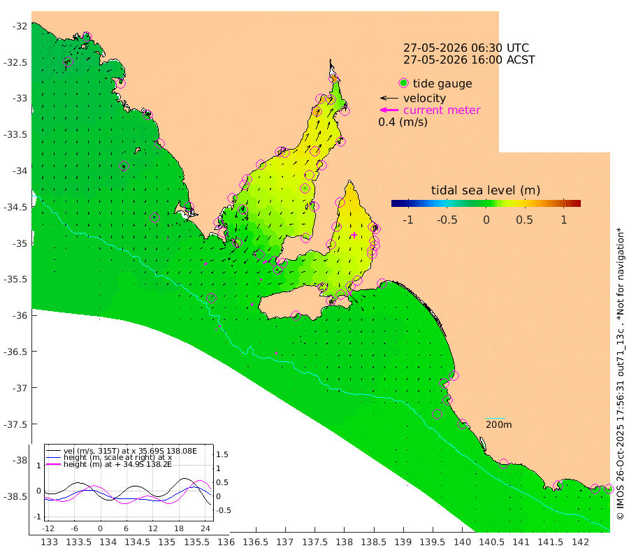 1cm/s -102T +10cm/s rms + 5cm/s 114T. SAM1DS 520m 6cm/s -122T +13cm/s rms + 5cm/s -36T. SAM2CP 100m 4cm/s -96T +21cm/s rms + 18cm/s 142T. SAM3MS 168m 5cm/s -70T +22cm/s rms + 0cm/s -30T. SAM4CY 117m 3cm/s -174T +23cm/s rms + 2cm/s 99T. SAM5CB 94m 4cm/s -134T +8cm/s rms + 3cm/s -172T. SAM6IS 83m 1cm/s -106T +11cm/s rms + 7cm/s 150T. SAM7DS 519m 10cm/s -119T +10cm/s rms + 2cm/s 87T. SAM8SG 47m 6cm/s -155T +20cm/s rms + 12cm/s -168T. NRSKAI 101m 8cm Warrnambool 5cm Port Fairy 4cm Portland 3cm Port Macdonnell -1cm Beachport 0cm Cape Rabelais (off) 0cm Robe 2cm Cape Jaffa 2cm Kingston 2cm Victor Harbor -5cm Vivonne Bay 21cm Kingscote 18cm American River 14cm Penneshaw 19cm Cape Jervis 29cm Second Valley 31cm Port Noarlunga 32cm Port Stanvac 33cm Brighton 35cm Glenelg 37cm Port Adelaide (Outer Harbor) 44cm Angus Inlet (Garden Island) 43cm Ardrossan 21cm Port Vincent 28cm Port Giles 4cm Stenhouse Bay 10cm Althorpe Island 2cm Pondalowie Bay 17cm Point Turton 14cm Port Victoria 17cm Cape Elizabeth 30cm Tiparra Reef Light 39cm Wallaroo 41cm Middle Bank 28cm Port Broughton 61cm Port Pirie 71cm Red Cliff Point (Beacon 5) 54cm Port Bonython 62cm Whyalla 63cm Western Shoal Beacon 37cm Franklin Harbor 29cm Franklin Harbor Entrance Beacon 18cm Arno Bay 18cm Port Neill 14cm Cape Hardy 10cm Tumby Bay 7cm Reevesby Island 2cm Port Lincoln -4cm Taylors Landing 12cm Whalers Bay 2cm Wedge Island Mooring -4cm Shelf Edge Mooring -6cm Coffin Bay Entrance Beacon -8cm Greenly Island -7cm Elliston -15cm Pearson Island -2cm Venus Bay -15cm Blanche Port (Streaky Bay) -16cm Thevenard -11cm St Francis Island