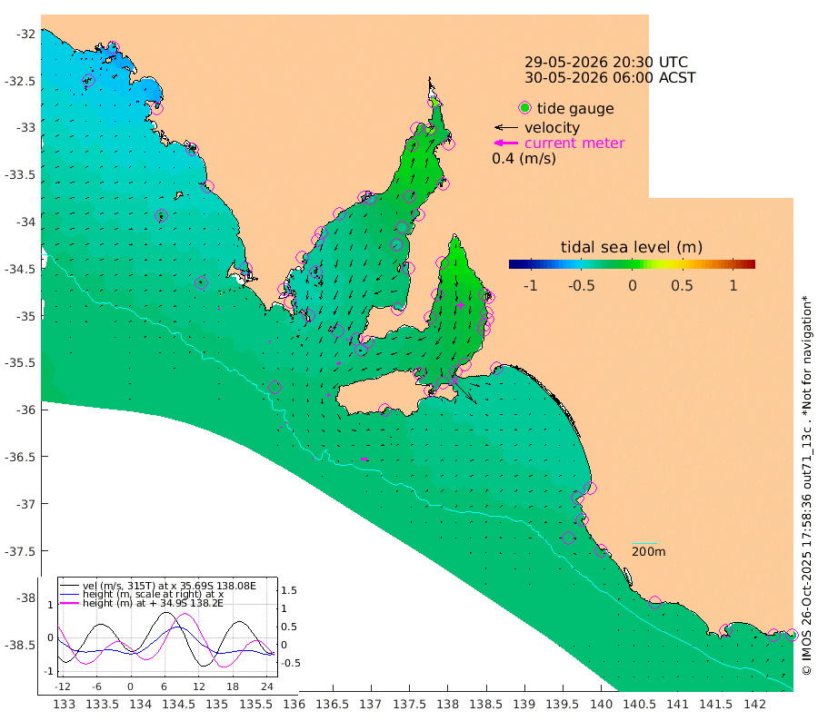 1cm/s 86T +10cm/s rms + 5cm/s 114T. SAM1DS 520m 1cm/s 105T +13cm/s rms + 5cm/s -36T. SAM2CP 100m 2cm/s 8T +21cm/s rms + 18cm/s 142T. SAM3MS 168m 9cm/s 89T +22cm/s rms + 0cm/s -30T. SAM4CY 117m 2cm/s 99T +23cm/s rms + 2cm/s 99T. SAM5CB 94m 6cm/s -118T +8cm/s rms + 3cm/s -172T. SAM6IS 83m 2cm/s -12T +11cm/s rms + 7cm/s 150T. SAM7DS 519m 2cm/s -169T +10cm/s rms + 2cm/s 87T. SAM8SG 47m 5cm/s -165T +20cm/s rms + 12cm/s -168T. NRSKAI 101m -27cm Warrnambool -26cm Port Fairy -27cm Portland -30cm Port Macdonnell -25cm Beachport -27cm Cape Rabelais (off) -30cm Robe -36cm Cape Jaffa -32cm Kingston -30cm Victor Harbor -22cm Vivonne Bay -20cm Kingscote -19cm American River -23cm Penneshaw -15cm Cape Jervis -12cm Second Valley -7cm Port Noarlunga -7cm Port Stanvac -7cm Brighton -5cm Glenelg -2cm Port Adelaide (Outer Harbor) 17cm Angus Inlet (Garden Island) 3cm Ardrossan -18cm Port Vincent -15cm Port Giles -30cm Stenhouse Bay -35cm Althorpe Island -30cm Pondalowie Bay -39cm Point Turton -35cm Port Victoria -37cm Cape Elizabeth -32cm Tiparra Reef Light -26cm Wallaroo -21cm Middle Bank -31cm Port Broughton 2cm Port Pirie 12cm Red Cliff Point (Beacon 5) 13cm Port Bonython 2cm Whyalla -6cm Western Shoal Beacon -30cm Franklin Harbor -34cm Franklin Harbor Entrance Beacon -35cm Arno Bay -40cm Port Neill -41cm Cape Hardy -42cm Tumby Bay -39cm Reevesby Island -40cm Port Lincoln -35cm Taylors Landing -37cm Whalers Bay -33cm Wedge Island Mooring -26cm Shelf Edge Mooring -37cm Coffin Bay Entrance Beacon -28cm Greenly Island -39cm Elliston -31cm Pearson Island -37cm Venus Bay -57cm Blanche Port (Streaky Bay) -52cm Thevenard -46cm St Francis Island