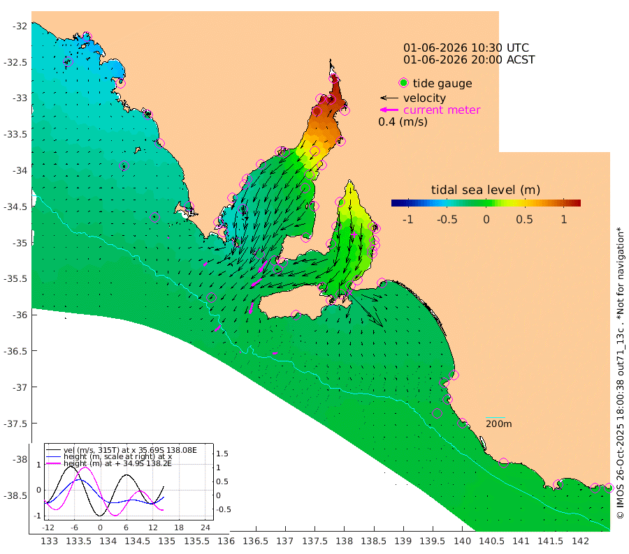 1cm/s -104T +10cm/s rms + 5cm/s 114T. SAM1DS 520m 10cm/s -134T +13cm/s rms + 5cm/s -36T. SAM2CP 100m 13cm/s -141T +21cm/s rms + 18cm/s 142T. SAM3MS 168m 10cm/s -100T +22cm/s rms + 0cm/s -30T. SAM4CY 117m 3cm/s 146T +23cm/s rms + 2cm/s 99T. SAM5CB 94m 28cm/s -127T +8cm/s rms + 3cm/s -172T. SAM6IS 83m 6cm/s -147T +11cm/s rms + 7cm/s 150T. SAM7DS 519m 32cm/s -145T +10cm/s rms + 2cm/s 87T. SAM8SG 47m 25cm/s -165T +20cm/s rms + 12cm/s -168T. NRSKAI 101m -4cm Warrnambool -5cm Port Fairy -7cm Portland -5cm Port Macdonnell -11cm Beachport -13cm Cape Rabelais (off) -12cm Robe -9cm Cape Jaffa -11cm Kingston -16cm Victor Harbor -21cm Vivonne Bay -3cm Kingscote 5cm American River -12cm Penneshaw 1cm Cape Jervis 15cm Second Valley 10cm Port Noarlunga 10cm Port Stanvac 12cm Brighton 10cm Glenelg 16cm Port Adelaide (Outer Harbor) 49cm Angus Inlet (Garden Island) 11cm Ardrossan -10cm Port Vincent -6cm Port Giles -22cm Stenhouse Bay -15cm Althorpe Island -14cm Pondalowie Bay -7cm Point Turton -6cm Port Victoria 1cm Cape Elizabeth 12cm Tiparra Reef Light 45cm Wallaroo 48cm Middle Bank 81cm Port Broughton 149cm Port Pirie 163cm Red Cliff Point (Beacon 5) 126cm Port Bonython 126cm Whyalla 111cm Western Shoal Beacon 37cm Franklin Harbor -4cm Franklin Harbor Entrance Beacon -22cm Arno Bay -34cm Port Neill -33cm Cape Hardy -37cm Tumby Bay -33cm Reevesby Island -40cm Port Lincoln -35cm Taylors Landing -16cm Whalers Bay -22cm Wedge Island Mooring -17cm Shelf Edge Mooring -28cm Coffin Bay Entrance Beacon -24cm Greenly Island -30cm Elliston -32cm Pearson Island -21cm Venus Bay -48cm Blanche Port (Streaky Bay) -49cm Thevenard -44cm St Francis Island