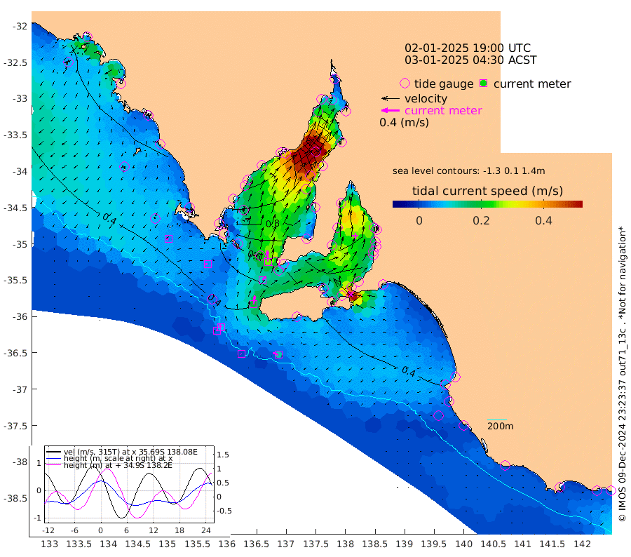 1cm/s -58T +10cm/s rms + 5cm/s 114T. SAM1DS 520m 5cm/s -91T +13cm/s rms + 5cm/s -36T. SAM2CP 100m 7cm/s -36T +21cm/s rms + 18cm/s 142T. SAM3MS 168m 12cm/s -70T +22cm/s rms + 0cm/s -30T. SAM4CY 117m 4cm/s -130T +23cm/s rms + 2cm/s 99T. SAM5CB 94m 10cm/s 44T +8cm/s rms + 3cm/s -172T. SAM6IS 83m 3cm/s -28T +11cm/s rms + 7cm/s 150T. SAM7DS 519m 25cm/s -3T +10cm/s rms + 2cm/s 87T. SAM8SG 47m 19cm/s 8T +20cm/s rms + 12cm/s -168T. NRSKAI 101m 35cm Warrnambool 36cm Port Fairy 36cm Portland 44cm Port Macdonnell 35cm Beachport 39cm Cape Rabelais (off) 38cm Robe 45cm Cape Jaffa 43cm Kingston 47cm Victor Harbor 33cm Vivonne Bay 74cm Kingscote 66cm American River 72cm Penneshaw 63cm Cape Jervis 73cm Second Valley 84cm Port Noarlunga 86cm Port Stanvac 86cm Brighton 91cm Glenelg 91cm Port Adelaide (Outer Harbor) 64cm Angus Inlet (Garden Island) 107cm Ardrossan 110cm Port Vincent 97cm Port Giles 61cm Stenhouse Bay 64cm Althorpe Island 53cm Pondalowie Bay 79cm Point Turton 79cm Port Victoria 81cm Cape Elizabeth 76cm Tiparra Reef Light 64cm Wallaroo 67cm Middle Bank 13cm Port Broughton -4cm Port Pirie -10cm Red Cliff Point (Beacon 5) 10cm Port Bonython 21cm Whyalla 30cm Western Shoal Beacon 73cm Franklin Harbor 98cm Franklin Harbor Entrance Beacon 96cm Arno Bay 107cm Port Neill 96cm Cape Hardy 93cm Tumby Bay 82cm Reevesby Island 80cm Port Lincoln 64cm Taylors Landing 74cm Whalers Bay 62cm Wedge Island Mooring 40cm Shelf Edge Mooring 52cm Coffin Bay Entrance Beacon 39cm Greenly Island 51cm Elliston 45cm Pearson Island 47cm Venus Bay 68cm Blanche Port (Streaky Bay) 62cm Thevenard 51cm St Francis Island