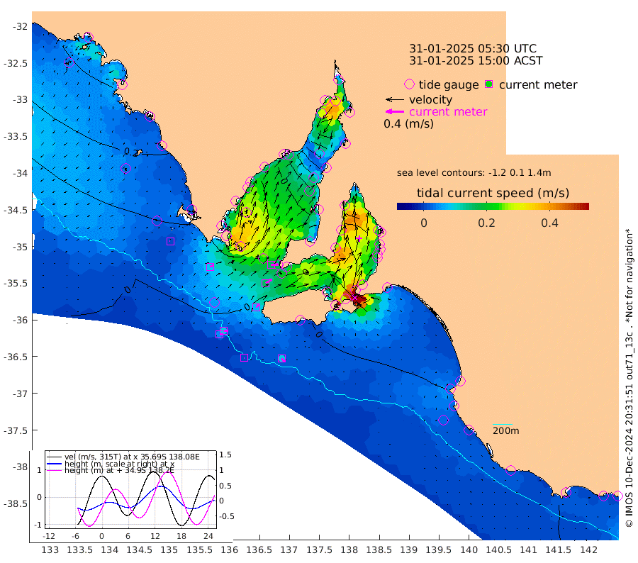 1cm/s 102T +10cm/s rms + 5cm/s 114T. SAM1DS 520m 8cm/s 65T +13cm/s rms + 5cm/s -36T. SAM2CP 100m 9cm/s 92T +21cm/s rms + 18cm/s 142T. SAM3MS 168m 10cm/s 134T +22cm/s rms + 0cm/s -30T. SAM4CY 117m 1cm/s -71T +23cm/s rms + 2cm/s 99T. SAM5CB 94m 16cm/s 61T +8cm/s rms + 3cm/s -172T. SAM6IS 83m 5cm/s 92T +11cm/s rms + 7cm/s 150T. SAM7DS 519m 16cm/s 89T +10cm/s rms + 2cm/s 87T. SAM8SG 47m 7cm/s 36T +20cm/s rms + 12cm/s -168T. NRSKAI 101m -14cm Warrnambool -12cm Port Fairy -11cm Portland -6cm Port Macdonnell -8cm Beachport -7cm Cape Rabelais (off) -5cm Robe -6cm Cape Jaffa -2cm Kingston -5cm Victor Harbor -2cm Vivonne Bay -24cm Kingscote -26cm American River -13cm Penneshaw -25cm Cape Jervis -37cm Second Valley -35cm Port Noarlunga -35cm Port Stanvac -39cm Brighton -34cm Glenelg -42cm Port Adelaide (Outer Harbor) -71cm Angus Inlet (Garden Island) -42cm Ardrossan -13cm Port Vincent -20cm Port Giles 5cm Stenhouse Bay -3cm Althorpe Island 2cm Pondalowie Bay -6cm Point Turton -6cm Port Victoria -16cm Cape Elizabeth -28cm Tiparra Reef Light -57cm Wallaroo -68cm Middle Bank -51cm Port Broughton -150cm Port Pirie -171cm Red Cliff Point (Beacon 5) -138cm Port Bonython -140cm Whyalla -123cm Western Shoal Beacon -44cm Franklin Harbor -23cm Franklin Harbor Entrance Beacon -6cm Arno Bay 5cm Port Neill 1cm Cape Hardy 6cm Tumby Bay 8cm Reevesby Island 14cm Port Lincoln 11cm Taylors Landing -1cm Whalers Bay 3cm Wedge Island Mooring -4cm Shelf Edge Mooring 11cm Coffin Bay Entrance Beacon 4cm Greenly Island 13cm Elliston 14cm Pearson Island 13cm Venus Bay 36cm Blanche Port (Streaky Bay) 36cm Thevenard 21cm St Francis Island