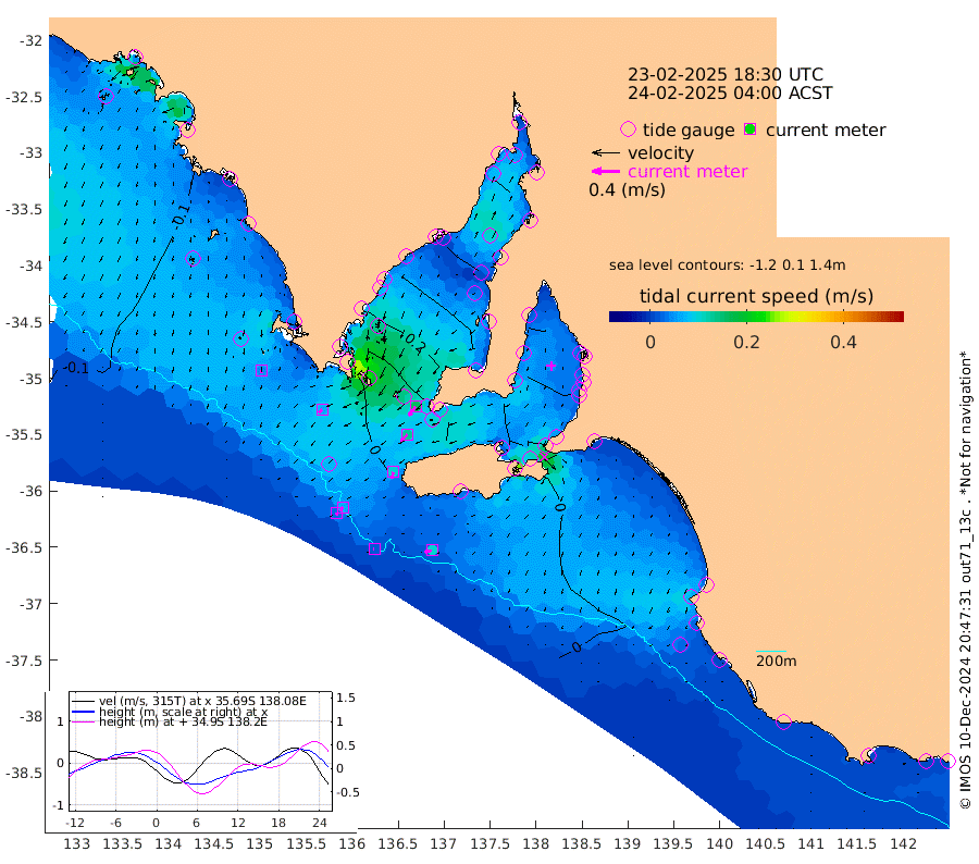 2cm/s -87T +10cm/s rms + 5cm/s 114T. SAM1DS 520m 7cm/s -134T +13cm/s rms + 5cm/s -36T. SAM2CP 100m 6cm/s -142T +21cm/s rms + 18cm/s 142T. SAM3MS 168m 10cm/s -106T +22cm/s rms + 0cm/s -30T. SAM4CY 117m 4cm/s -175T +23cm/s rms + 2cm/s 99T. SAM5CB 94m 13cm/s -137T +8cm/s rms + 3cm/s -172T. SAM6IS 83m 3cm/s -158T +11cm/s rms + 7cm/s 150T. SAM7DS 519m 16cm/s -144T +10cm/s rms + 2cm/s 87T. SAM8SG 47m 10cm/s -165T +20cm/s rms + 12cm/s -168T. NRSKAI 101m 12cm Warrnambool 10cm Port Fairy 7cm Portland 12cm Port Macdonnell 2cm Beachport 3cm Cape Rabelais (off) 5cm Robe 8cm Cape Jaffa 7cm Kingston 3cm Victor Harbor -7cm Vivonne Bay 21cm Kingscote 20cm American River 15cm Penneshaw 18cm Cape Jervis 25cm Second Valley 30cm Port Noarlunga 32cm Port Stanvac 29cm Brighton 32cm Glenelg 35cm Port Adelaide (Outer Harbor) 36cm Angus Inlet (Garden Island) 39cm Ardrossan 31cm Port Vincent 30cm Port Giles 9cm Stenhouse Bay 11cm Althorpe Island 11cm Pondalowie Bay 31cm Point Turton 29cm Port Victoria 33cm Cape Elizabeth 37cm Tiparra Reef Light 43cm Wallaroo 43cm Middle Bank 44cm Port Broughton 47cm Port Pirie 46cm Red Cliff Point (Beacon 5) 45cm Port Bonython 49cm Whyalla 47cm Western Shoal Beacon 48cm Franklin Harbor 34cm Franklin Harbor Entrance Beacon 25cm Arno Bay 24cm Port Neill 19cm Cape Hardy 14cm Tumby Bay 14cm Reevesby Island 8cm Port Lincoln 2cm Taylors Landing 19cm Whalers Bay 8cm Wedge Island Mooring -3cm Shelf Edge Mooring -1cm Coffin Bay Entrance Beacon -7cm Greenly Island -5cm Elliston -11cm Pearson Island 5cm Venus Bay -4cm Blanche Port (Streaky Bay) -8cm Thevenard -13cm St Francis Island