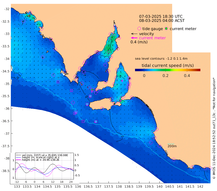 1cm/s -73T +10cm/s rms + 5cm/s 114T. SAM1DS 520m 3cm/s -168T +13cm/s rms + 5cm/s -36T. SAM2CP 100m 6cm/s 167T +21cm/s rms + 18cm/s 142T. SAM3MS 168m 8cm/s -125T +22cm/s rms + 0cm/s -30T. SAM4CY 117m 3cm/s 176T +23cm/s rms + 2cm/s 99T. SAM5CB 94m 9cm/s -160T +8cm/s rms + 3cm/s -172T. SAM6IS 83m 3cm/s 165T +11cm/s rms + 7cm/s 150T. SAM7DS 519m 18cm/s -172T +10cm/s rms + 2cm/s 87T. SAM8SG 47m 9cm/s -174T +20cm/s rms + 12cm/s -168T. NRSKAI 101m 10cm Warrnambool 7cm Port Fairy 6cm Portland 9cm Port Macdonnell 0cm Beachport 1cm Cape Rabelais (off) 5cm Robe 5cm Cape Jaffa 5cm Kingston -1cm Victor Harbor -6cm Vivonne Bay -7cm Kingscote -5cm American River -4cm Penneshaw -6cm Cape Jervis -9cm Second Valley -11cm Port Noarlunga -11cm Port Stanvac -13cm Brighton -12cm Glenelg -14cm Port Adelaide (Outer Harbor) -21cm Angus Inlet (Garden Island) -16cm Ardrossan -15cm Port Vincent -6cm Port Giles 4cm Stenhouse Bay 4cm Althorpe Island 4cm Pondalowie Bay 13cm Point Turton 10cm Port Victoria 8cm Cape Elizabeth 10cm Tiparra Reef Light 6cm Wallaroo 0cm Middle Bank 28cm Port Broughton -13cm Port Pirie -21cm Red Cliff Point (Beacon 5) -20cm Port Bonython -15cm Whyalla -10cm Western Shoal Beacon 9cm Franklin Harbor 2cm Franklin Harbor Entrance Beacon 2cm Arno Bay 6cm Port Neill 3cm Cape Hardy 2cm Tumby Bay 0cm Reevesby Island 2cm Port Lincoln -2cm Taylors Landing 7cm Whalers Bay 0cm Wedge Island Mooring -6cm Shelf Edge Mooring -2cm Coffin Bay Entrance Beacon -7cm Greenly Island -3cm Elliston -7cm Pearson Island 5cm Venus Bay 3cm Blanche Port (Streaky Bay) -1cm Thevenard 3cm St Francis Island