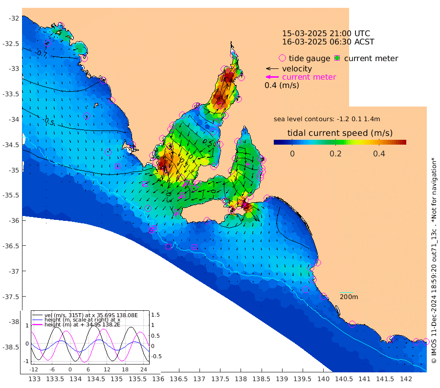 0cm/s -145T +10cm/s rms + 5cm/s 114T. SAM1DS 520m 10cm/s -125T +13cm/s rms + 5cm/s -36T. SAM2CP 100m 5cm/s -102T +21cm/s rms + 18cm/s 142T. SAM3MS 168m 3cm/s -154T +22cm/s rms + 0cm/s -30T. SAM4CY 117m 6cm/s 179T +23cm/s rms + 2cm/s 99T. SAM5CB 94m 16cm/s -126T +8cm/s rms + 3cm/s -172T. SAM6IS 83m 2cm/s -98T +11cm/s rms + 7cm/s 150T. SAM7DS 519m 18cm/s -134T +10cm/s rms + 2cm/s 87T. SAM8SG 47m 15cm/s -162T +20cm/s rms + 12cm/s -168T. NRSKAI 101m -33cm Warrnambool -32cm Port Fairy -34cm Portland -31cm Port Macdonnell -33cm Beachport -34cm Cape Rabelais (off) -35cm Robe -37cm Cape Jaffa -37cm Kingston -33cm Victor Harbor -37cm Vivonne Bay 36cm Kingscote 30cm American River 12cm Penneshaw 27cm Cape Jervis 51cm Second Valley 73cm Port Noarlunga 77cm Port Stanvac 80cm Brighton 82cm Glenelg 95cm Port Adelaide (Outer Harbor) 110cm Angus Inlet (Garden Island) 117cm Ardrossan 81cm Port Vincent 66cm Port Giles -16cm Stenhouse Bay -18cm Althorpe Island -17cm Pondalowie Bay 3cm Point Turton 6cm Port Victoria 13cm Cape Elizabeth 15cm Tiparra Reef Light 31cm Wallaroo 40cm Middle Bank 12cm Port Broughton 55cm Port Pirie 66cm Red Cliff Point (Beacon 5) 70cm Port Bonython 68cm Whyalla 57cm Western Shoal Beacon 38cm Franklin Harbor 20cm Franklin Harbor Entrance Beacon 7cm Arno Bay -1cm Port Neill -8cm Cape Hardy -16cm Tumby Bay -18cm Reevesby Island -28cm Port Lincoln -33cm Taylors Landing -9cm Whalers Bay -24cm Wedge Island Mooring -34cm Shelf Edge Mooring -47cm Coffin Bay Entrance Beacon -42cm Greenly Island -51cm Elliston -49cm Pearson Island -37cm Venus Bay -72cm Blanche Port (Streaky Bay) -73cm Thevenard -73cm St Francis Island