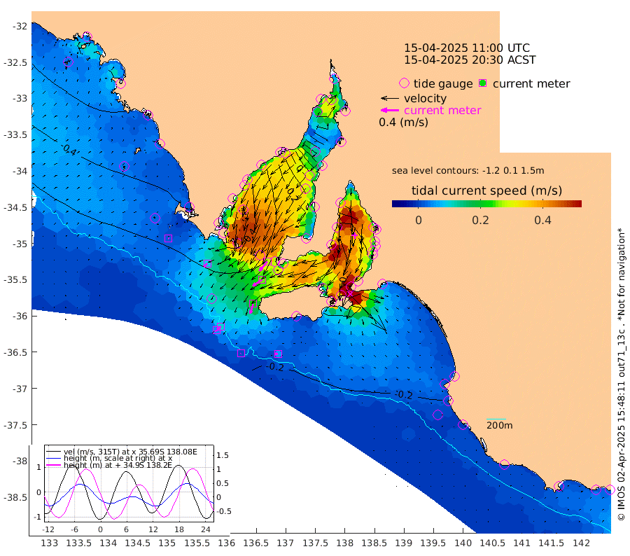 1cm/s -129T +10cm/s rms + 5cm/s 114T. SAM1DS 520m 9cm/s -129T +13cm/s rms + 5cm/s -36T. SAM2CP 100m 10cm/s -128T +21cm/s rms + 18cm/s 142T. SAM3MS 168m 6cm/s -77T +22cm/s rms + 0cm/s -30T. SAM4CY 117m 2cm/s 127T +23cm/s rms + 2cm/s 99T. SAM5CB 94m 25cm/s -123T +8cm/s rms + 3cm/s -172T. SAM6IS 83m 5cm/s -126T +11cm/s rms + 7cm/s 150T. SAM7DS 519m 28cm/s -139T +10cm/s rms + 2cm/s 87T. SAM8SG 47m 23cm/s -164T +20cm/s rms + 12cm/s -168T. NRSKAI 101m -12cm Warrnambool -11cm Port Fairy -13cm Portland -15cm Port Macdonnell -16cm Beachport -18cm Cape Rabelais (off) -18cm Robe -16cm Cape Jaffa -18cm Kingston -20cm Victor Harbor -22cm Vivonne Bay 0cm Kingscote 7cm American River -12cm Penneshaw 4cm Cape Jervis 20cm Second Valley 16cm Port Noarlunga 16cm Port Stanvac 19cm Brighton 16cm Glenelg 24cm Port Adelaide (Outer Harbor) 61cm Angus Inlet (Garden Island) 21cm Ardrossan -5cm Port Vincent -4cm Port Giles -29cm Stenhouse Bay -21cm Althorpe Island -22cm Pondalowie Bay -19cm Point Turton -17cm Port Victoria -7cm Cape Elizabeth 7cm Tiparra Reef Light 43cm Wallaroo 50cm Middle Bank 68cm Port Broughton 163cm Port Pirie 186cm Red Cliff Point (Beacon 5) 140cm Port Bonython 141cm Whyalla 124cm Western Shoal Beacon 33cm Franklin Harbor -8cm Franklin Harbor Entrance Beacon -28cm Arno Bay -44cm Port Neill -39cm Cape Hardy -44cm Tumby Bay -38cm Reevesby Island -48cm Port Lincoln -41cm Taylors Landing -24cm Whalers Bay -28cm Wedge Island Mooring -20cm Shelf Edge Mooring -34cm Coffin Bay Entrance Beacon -27cm Greenly Island -36cm Elliston -38cm Pearson Island -29cm Venus Bay -60cm Blanche Port (Streaky Bay) -60cm Thevenard -50cm St Francis Island