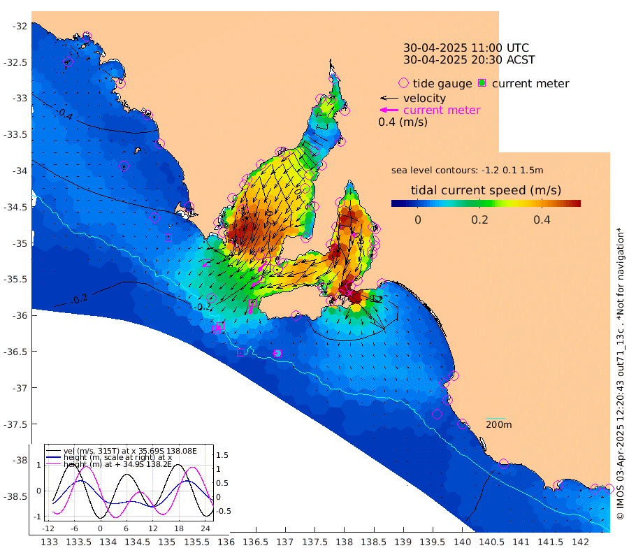 1cm/s -126T +10cm/s rms + 5cm/s 114T. SAM1DS 520m 11cm/s -132T +13cm/s rms + 5cm/s -36T. SAM2CP 100m 12cm/s -135T +21cm/s rms + 18cm/s 142T. SAM3MS 168m 10cm/s -90T +22cm/s rms + 0cm/s -30T. SAM4CY 117m 2cm/s 155T +23cm/s rms + 2cm/s 99T. SAM5CB 94m 27cm/s -126T +8cm/s rms + 3cm/s -172T. SAM6IS 83m 5cm/s -137T +11cm/s rms + 7cm/s 150T. SAM7DS 519m 31cm/s -139T +10cm/s rms + 2cm/s 87T. SAM8SG 47m 24cm/s -164T +20cm/s rms + 12cm/s -168T. NRSKAI 101m -3cm Warrnambool -4cm Port Fairy -6cm Portland -6cm Port Macdonnell -10cm Beachport -10cm Cape Rabelais (off) -11cm Robe -9cm Cape Jaffa -10cm Kingston -13cm Victor Harbor -18cm Vivonne Bay 9cm Kingscote 17cm American River -2cm Penneshaw 13cm Cape Jervis 28cm Second Valley 26cm Port Noarlunga 27cm Port Stanvac 30cm Brighton 28cm Glenelg 35cm Port Adelaide (Outer Harbor) 71cm Angus Inlet (Garden Island) 34cm Ardrossan 8cm Port Vincent 8cm Port Giles -19cm Stenhouse Bay -8cm Althorpe Island -12cm Pondalowie Bay -5cm Point Turton -3cm Port Victoria 4cm Cape Elizabeth 23cm Tiparra Reef Light 57cm Wallaroo 62cm Middle Bank 85cm Port Broughton 171cm Port Pirie 190cm Red Cliff Point (Beacon 5) 151cm Port Bonython 149cm Whyalla 134cm Western Shoal Beacon 43cm Franklin Harbor 3cm Franklin Harbor Entrance Beacon -15cm Arno Bay -26cm Port Neill -25cm Cape Hardy -31cm Tumby Bay -26cm Reevesby Island -36cm Port Lincoln -34cm Taylors Landing -11cm Whalers Bay -20cm Wedge Island Mooring -15cm Shelf Edge Mooring -26cm Coffin Bay Entrance Beacon -22cm Greenly Island -29cm Elliston -28cm Pearson Island -19cm Venus Bay -48cm Blanche Port (Streaky Bay) -49cm Thevenard -31cm St Francis Island