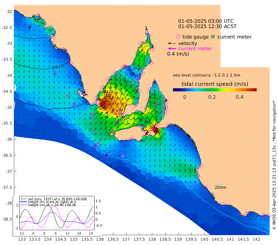 1cm/s 67T +10cm/s rms + 5cm/s 114T. SAM1DS 520m 11cm/s 40T +13cm/s rms + 5cm/s -36T. SAM2CP 100m 8cm/s 17T +21cm/s rms + 18cm/s 142T. SAM3MS 168m 8cm/s 29T +22cm/s rms + 0cm/s -30T. SAM4CY 117m 6cm/s -6T +23cm/s rms + 2cm/s 99T. SAM5CB 94m 20cm/s 44T +8cm/s rms + 3cm/s -172T. SAM6IS 83m 4cm/s 9T +11cm/s rms + 7cm/s 150T. SAM7DS 519m 35cm/s 23T +10cm/s rms + 2cm/s 87T. SAM8SG 47m 27cm/s 12T +20cm/s rms + 12cm/s -168T. NRSKAI 101m 47cm Warrnambool 45cm Port Fairy 46cm Portland 41cm Port Macdonnell 46cm Beachport 46cm Cape Rabelais (off) 45cm Robe 44cm Cape Jaffa 44cm Kingston 45cm Victor Harbor 51cm Vivonne Bay -19cm Kingscote -19cm American River 1cm Penneshaw -14cm Cape Jervis -36cm Second Valley -54cm Port Noarlunga -57cm Port Stanvac -61cm Brighton -65cm Glenelg -74cm Port Adelaide (Outer Harbor) -87cm Angus Inlet (Garden Island) -94cm Ardrossan -66cm Port Vincent -48cm Port Giles 25cm Stenhouse Bay 24cm Althorpe Island 24cm Pondalowie Bay 9cm Point Turton 4cm Port Victoria 0cm Cape Elizabeth -4cm Tiparra Reef Light -20cm Wallaroo -23cm Middle Bank -39cm Port Broughton -49cm Port Pirie -59cm Red Cliff Point (Beacon 5) -49cm Port Bonython -51cm Whyalla -47cm Western Shoal Beacon -26cm Franklin Harbor 2cm Franklin Harbor Entrance Beacon 14cm Arno Bay 21cm Port Neill 25cm Cape Hardy 32cm Tumby Bay 33cm Reevesby Island 42cm Port Lincoln 48cm Taylors Landing 16cm Whalers Bay 35cm Wedge Island Mooring 47cm Shelf Edge Mooring 54cm Coffin Bay Entrance Beacon 52cm Greenly Island 56cm Elliston 55cm Pearson Island 37cm Venus Bay 70cm Blanche Port (Streaky Bay) 72cm Thevenard 68cm St Francis Island