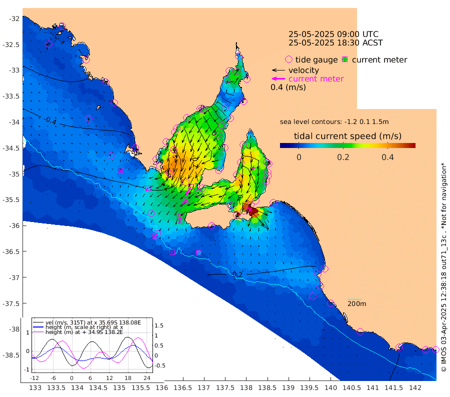 1cm/s -112T +10cm/s rms + 5cm/s 114T. SAM1DS 520m 9cm/s -135T +13cm/s rms + 5cm/s -36T. SAM2CP 100m 9cm/s -138T +21cm/s rms + 18cm/s 142T. SAM3MS 168m 6cm/s -101T +22cm/s rms + 0cm/s -30T. SAM4CY 117m 3cm/s 152T +23cm/s rms + 2cm/s 99T. SAM5CB 94m 20cm/s -132T +8cm/s rms + 3cm/s -172T. SAM6IS 83m 4cm/s -140T +11cm/s rms + 7cm/s 150T. SAM7DS 519m 29cm/s -148T +10cm/s rms + 2cm/s 87T. SAM8SG 47m 21cm/s -164T +20cm/s rms + 12cm/s -168T. NRSKAI 101m -6cm Warrnambool -8cm Port Fairy -11cm Portland -11cm Port Macdonnell -16cm Beachport -17cm Cape Rabelais (off) -17cm Robe -16cm Cape Jaffa -15cm Kingston -20cm Victor Harbor -25cm Vivonne Bay -4cm Kingscote 1cm American River -12cm Penneshaw -1cm Cape Jervis 13cm Second Valley 10cm Port Noarlunga 10cm Port Stanvac 11cm Brighton 10cm Glenelg 16cm Port Adelaide (Outer Harbor) 41cm Angus Inlet (Garden Island) 15cm Ardrossan -8cm Port Vincent -4cm Port Giles -25cm Stenhouse Bay -17cm Althorpe Island -20cm Pondalowie Bay -12cm Point Turton -15cm Port Victoria -6cm Cape Elizabeth 7cm Tiparra Reef Light 31cm Wallaroo 34cm Middle Bank 56cm Port Broughton 113cm Port Pirie 133cm Red Cliff Point (Beacon 5) 97cm Port Bonython 98cm Whyalla 87cm Western Shoal Beacon 27cm Franklin Harbor -7cm Franklin Harbor Entrance Beacon -24cm Arno Bay -30cm Port Neill -31cm Cape Hardy -36cm Tumby Bay -35cm Reevesby Island -41cm Port Lincoln -39cm Taylors Landing -21cm Whalers Bay -28cm Wedge Island Mooring -24cm Shelf Edge Mooring -35cm Coffin Bay Entrance Beacon -31cm Greenly Island -38cm Elliston -40cm Pearson Island -27cm Venus Bay -57cm Blanche Port (Streaky Bay) -59cm Thevenard -44cm St Francis Island