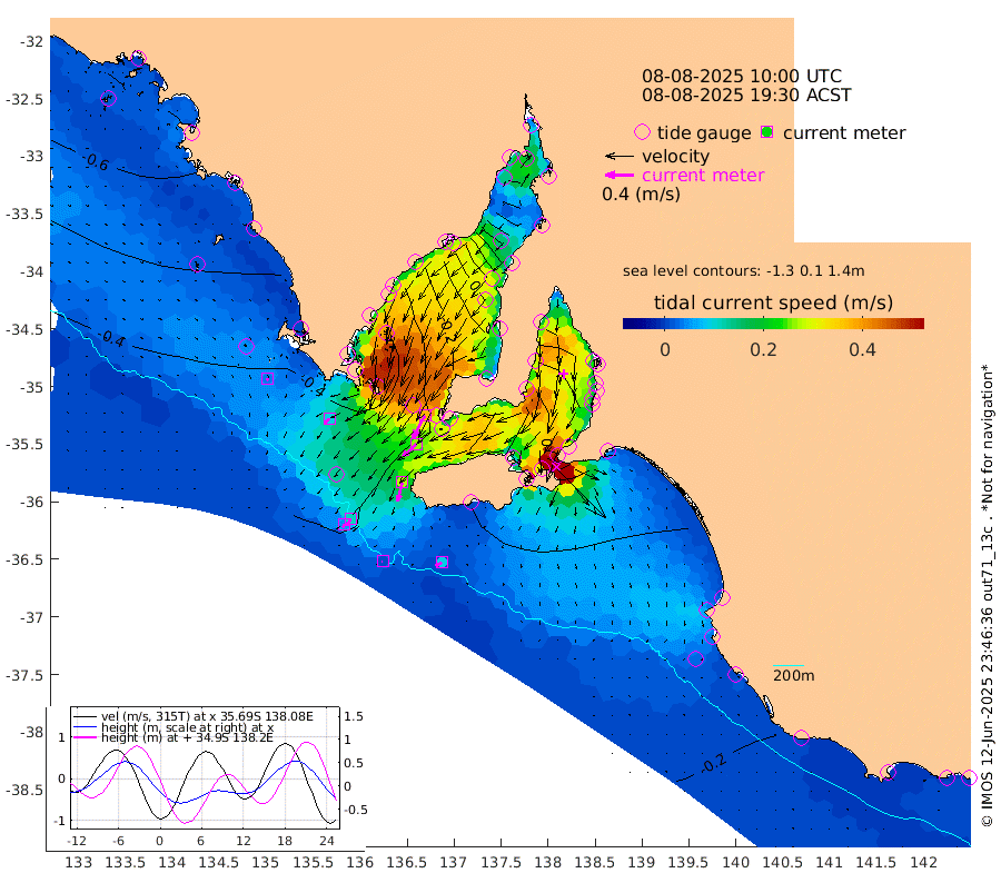 1cm/s -95T +10cm/s rms + 5cm/s 114T. SAM1DS 520m 9cm/s -136T +13cm/s rms + 5cm/s -36T. SAM2CP 100m 11cm/s -152T +21cm/s rms + 18cm/s 142T. SAM3MS 168m 10cm/s -123T +22cm/s rms + 0cm/s -30T. SAM4CY 117m 4cm/s 158T +23cm/s rms + 2cm/s 99T. SAM5CB 94m 26cm/s -132T +8cm/s rms + 3cm/s -172T. SAM6IS 83m 5cm/s -155T +11cm/s rms + 7cm/s 150T. SAM7DS 519m 37cm/s -152T +10cm/s rms + 2cm/s 87T. SAM8SG 47m 27cm/s -166T +20cm/s rms + 12cm/s -168T. NRSKAI 101m -13cm Warrnambool -15cm Port Fairy -18cm Portland -17cm Port Macdonnell -22cm Beachport -23cm Cape Rabelais (off) -22cm Robe -24cm Cape Jaffa -24cm Kingston -29cm Victor Harbor -32cm Vivonne Bay -1cm Kingscote 3cm American River -16cm Penneshaw -2cm Cape Jervis 14cm Second Valley 17cm Port Noarlunga 18cm Port Stanvac 19cm Brighton 18cm Glenelg 26cm Port Adelaide (Outer Harbor) 58cm Angus Inlet (Garden Island) 27cm Ardrossan 1cm Port Vincent 3cm Port Giles -27cm Stenhouse Bay -24cm Althorpe Island -21cm Pondalowie Bay -10cm Point Turton -12cm Port Victoria -5cm Cape Elizabeth 6cm Tiparra Reef Light 34cm Wallaroo 37cm Middle Bank 68cm Port Broughton 120cm Port Pirie 128cm Red Cliff Point (Beacon 5) 110cm Port Bonython 105cm Whyalla 88cm Western Shoal Beacon 30cm Franklin Harbor -11cm Franklin Harbor Entrance Beacon -27cm Arno Bay -37cm Port Neill -40cm Cape Hardy -46cm Tumby Bay -42cm Reevesby Island -49cm Port Lincoln -45cm Taylors Landing -24cm Whalers Bay -32cm Wedge Island Mooring -29cm Shelf Edge Mooring -43cm Coffin Bay Entrance Beacon -39cm Greenly Island -48cm Elliston -47cm Pearson Island -33cm Venus Bay -69cm Blanche Port (Streaky Bay) -71cm Thevenard -64cm St Francis Island