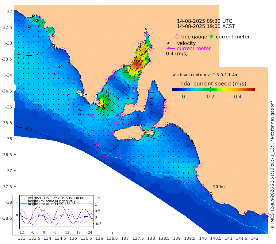 0cm/s 28T +10cm/s rms + 5cm/s 114T. SAM1DS 520m 6cm/s -121T +13cm/s rms + 5cm/s -36T. SAM2CP 100m 2cm/s -54T +21cm/s rms + 18cm/s 142T. SAM3MS 168m 3cm/s -144T +22cm/s rms + 0cm/s -30T. SAM4CY 117m 5cm/s -171T +23cm/s rms + 2cm/s 99T. SAM5CB 94m 6cm/s -129T +8cm/s rms + 3cm/s -172T. SAM6IS 83m 0cm/s 6T +11cm/s rms + 7cm/s 150T. SAM7DS 519m 6cm/s -133T +10cm/s rms + 2cm/s 87T. SAM8SG 47m 4cm/s -161T +20cm/s rms + 12cm/s -168T. NRSKAI 101m -28cm Warrnambool -26cm Port Fairy -27cm Portland -19cm Port Macdonnell -24cm Beachport -24cm Cape Rabelais (off) -24cm Robe -22cm Cape Jaffa -24cm Kingston -20cm Victor Harbor -25cm Vivonne Bay 38cm Kingscote 32cm American River 23cm Penneshaw 28cm Cape Jervis 49cm Second Valley 67cm Port Noarlunga 71cm Port Stanvac 75cm Brighton 77cm Glenelg 85cm Port Adelaide (Outer Harbor) 78cm Angus Inlet (Garden Island) 106cm Ardrossan 88cm Port Vincent 72cm Port Giles 2cm Stenhouse Bay -1cm Althorpe Island -3cm Pondalowie Bay 16cm Point Turton 20cm Port Victoria 24cm Cape Elizabeth 14cm Tiparra Reef Light 14cm Wallaroo 20cm Middle Bank -8cm Port Broughton -19cm Port Pirie -13cm Red Cliff Point (Beacon 5) -5cm Port Bonython 2cm Whyalla 4cm Western Shoal Beacon 32cm Franklin Harbor 31cm Franklin Harbor Entrance Beacon 24cm Arno Bay 22cm Port Neill 16cm Cape Hardy 11cm Tumby Bay 2cm Reevesby Island 0cm Port Lincoln -9cm Taylors Landing 10cm Whalers Bay -6cm Wedge Island Mooring -21cm Shelf Edge Mooring -24cm Coffin Bay Entrance Beacon -24cm Greenly Island -24cm Elliston -26cm Pearson Island -16cm Venus Bay -31cm Blanche Port (Streaky Bay) -33cm Thevenard -40cm St Francis Island