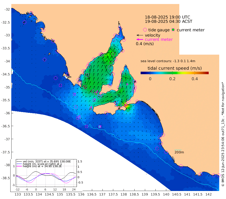 1cm/s 76T +10cm/s rms + 5cm/s 114T. SAM1DS 520m 5cm/s 43T +13cm/s rms + 5cm/s -36T. SAM2CP 100m 7cm/s 14T +21cm/s rms + 18cm/s 142T. SAM3MS 168m 9cm/s 67T +22cm/s rms + 0cm/s -30T. SAM4CY 117m 0cm/s -6T +23cm/s rms + 2cm/s 99T. SAM5CB 94m 11cm/s 40T +8cm/s rms + 3cm/s -172T. SAM6IS 83m 4cm/s 20T +11cm/s rms + 7cm/s 150T. SAM7DS 519m 22cm/s 26T +10cm/s rms + 2cm/s 87T. SAM8SG 47m 16cm/s 13T +20cm/s rms + 12cm/s -168T. NRSKAI 101m 8cm Warrnambool 7cm Port Fairy 7cm Portland 4cm Port Macdonnell 6cm Beachport 5cm Cape Rabelais (off) 5cm Robe 2cm Cape Jaffa 4cm Kingston 6cm Victor Harbor 9cm Vivonne Bay -6cm Kingscote -10cm American River 4cm Penneshaw -4cm Cape Jervis -10cm Second Valley -9cm Port Noarlunga -8cm Port Stanvac -12cm Brighton -10cm Glenelg -10cm Port Adelaide (Outer Harbor) -22cm Angus Inlet (Garden Island) -10cm Ardrossan -11cm Port Vincent -1cm Port Giles 5cm Stenhouse Bay 0cm Althorpe Island 0cm Pondalowie Bay -1cm Point Turton 0cm Port Victoria -3cm Cape Elizabeth -8cm Tiparra Reef Light -23cm Wallaroo -21cm Middle Bank -59cm Port Broughton -67cm Port Pirie -67cm Red Cliff Point (Beacon 5) -54cm Port Bonython -54cm Whyalla -50cm Western Shoal Beacon -16cm Franklin Harbor 5cm Franklin Harbor Entrance Beacon 10cm Arno Bay 13cm Port Neill 11cm Cape Hardy 12cm Tumby Bay 10cm Reevesby Island 15cm Port Lincoln 12cm Taylors Landing 1cm Whalers Bay 5cm Wedge Island Mooring 5cm Shelf Edge Mooring 5cm Coffin Bay Entrance Beacon 8cm Greenly Island 5cm Elliston 4cm Pearson Island -1cm Venus Bay 4cm Blanche Port (Streaky Bay) 7cm Thevenard 5cm St Francis Island