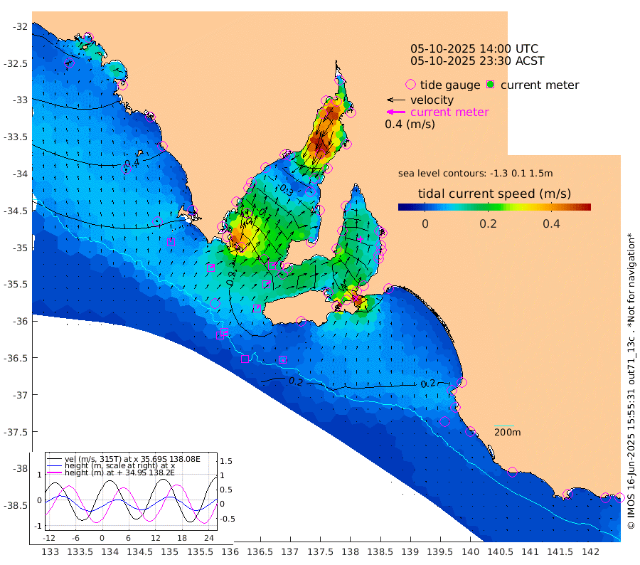 1cm/s 117T +10cm/s rms + 5cm/s 114T. SAM1DS 520m 9cm/s 54T +13cm/s rms + 5cm/s -36T. SAM2CP 100m 7cm/s 96T +21cm/s rms + 18cm/s 142T. SAM3MS 168m 4cm/s 126T +22cm/s rms + 0cm/s -30T. SAM4CY 117m 5cm/s -7T +23cm/s rms + 2cm/s 99T. SAM5CB 94m 11cm/s 56T +8cm/s rms + 3cm/s -172T. SAM6IS 83m 3cm/s 98T +11cm/s rms + 7cm/s 150T. SAM7DS 519m 14cm/s 65T +10cm/s rms + 2cm/s 87T. SAM8SG 47m 9cm/s 24T +20cm/s rms + 12cm/s -168T. NRSKAI 101m 13cm Warrnambool 14cm Port Fairy 15cm Portland 16cm Port Macdonnell 17cm Beachport 19cm Cape Rabelais (off) 18cm Robe 18cm Cape Jaffa 20cm Kingston 17cm Victor Harbor 24cm Vivonne Bay -35cm Kingscote -30cm American River -20cm Penneshaw -31cm Cape Jervis -50cm Second Valley -63cm Port Noarlunga -67cm Port Stanvac -69cm Brighton -71cm Glenelg -81cm Port Adelaide (Outer Harbor) -92cm Angus Inlet (Garden Island) -97cm Ardrossan -59cm Port Vincent -58cm Port Giles 8cm Stenhouse Bay 6cm Althorpe Island 10cm Pondalowie Bay -10cm Point Turton -14cm Port Victoria -22cm Cape Elizabeth -25cm Tiparra Reef Light -42cm Wallaroo -52cm Middle Bank -18cm Port Broughton -72cm Port Pirie -90cm Red Cliff Point (Beacon 5) -72cm Port Bonython -81cm Whyalla -73cm Western Shoal Beacon -47cm Franklin Harbor -32cm Franklin Harbor Entrance Beacon -16cm Arno Bay -8cm Port Neill -5cm Cape Hardy 2cm Tumby Bay 8cm Reevesby Island 15cm Port Lincoln 22cm Taylors Landing -2cm Whalers Bay 13cm Wedge Island Mooring 22cm Shelf Edge Mooring 33cm Coffin Bay Entrance Beacon 28cm Greenly Island 35cm Elliston 40cm Pearson Island 27cm Venus Bay 57cm Blanche Port (Streaky Bay) 58cm Thevenard 51cm St Francis Island
