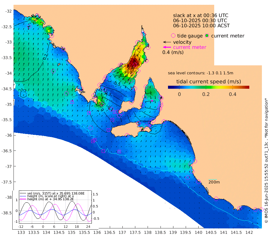 1cm/s -73T +10cm/s rms + 5cm/s 114T. SAM1DS 520m 6cm/s 61T +13cm/s rms + 5cm/s -36T. SAM2CP 100m 2cm/s 158T +21cm/s rms + 18cm/s 142T. SAM3MS 168m 4cm/s -5T +22cm/s rms + 0cm/s -30T. SAM4CY 117m 6cm/s 17T +23cm/s rms + 2cm/s 99T. SAM5CB 94m 2cm/s 25T +8cm/s rms + 3cm/s -172T. SAM6IS 83m 1cm/s -144T +11cm/s rms + 7cm/s 150T. SAM7DS 519m 4cm/s 89T +10cm/s rms + 2cm/s 87T. SAM8SG 47m 2cm/s 16T +20cm/s rms + 12cm/s -168T. NRSKAI 101m 12cm Warrnambool 12cm Port Fairy 13cm Portland 10cm Port Macdonnell 14cm Beachport 14cm Cape Rabelais (off) 13cm Robe 15cm Cape Jaffa 15cm Kingston 10cm Victor Harbor 16cm Vivonne Bay -46cm Kingscote -36cm American River -31cm Penneshaw -35cm Cape Jervis -48cm Second Valley -73cm Port Noarlunga -77cm Port Stanvac -76cm Brighton -80cm Glenelg -89cm Port Adelaide (Outer Harbor) -79cm Angus Inlet (Garden Island) -113cm Ardrossan -94cm Port Vincent -79cm Port Giles -13cm Stenhouse Bay -8cm Althorpe Island -7cm Pondalowie Bay -33cm Point Turton -32cm Port Victoria -33cm Cape Elizabeth -33cm Tiparra Reef Light -26cm Wallaroo -30cm Middle Bank 19cm Port Broughton 26cm Port Pirie 32cm Red Cliff Point (Beacon 5) 3cm Port Bonython 0cm Whyalla -5cm Western Shoal Beacon -40cm Franklin Harbor -46cm Franklin Harbor Entrance Beacon -41cm Arno Bay -43cm Port Neill -33cm Cape Hardy -26cm Tumby Bay -26cm Reevesby Island -17cm Port Lincoln -3cm Taylors Landing -22cm Whalers Bay -5cm Wedge Island Mooring 14cm Shelf Edge Mooring 13cm Coffin Bay Entrance Beacon 16cm Greenly Island 18cm Elliston 19cm Pearson Island 6cm Venus Bay 17cm Blanche Port (Streaky Bay) 19cm Thevenard 21cm St Francis Island