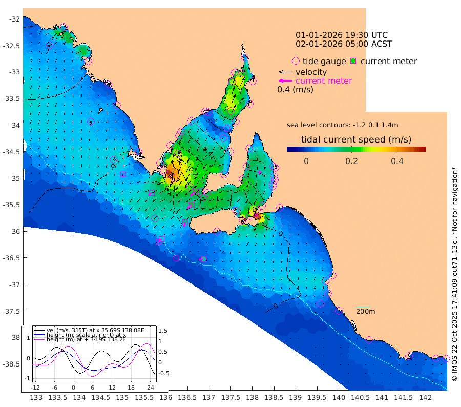 1cm/s -106T +10cm/s rms + 5cm/s 114T. SAM1DS 520m 12cm/s -127T +13cm/s rms + 5cm/s -36T. SAM2CP 100m 9cm/s -123T +21cm/s rms + 18cm/s 142T. SAM3MS 168m 13cm/s -95T +22cm/s rms + 0cm/s -30T. SAM4CY 117m 5cm/s -171T +23cm/s rms + 2cm/s 99T. SAM5CB 94m 18cm/s -131T +8cm/s rms + 3cm/s -172T. SAM6IS 83m 4cm/s -133T +11cm/s rms + 7cm/s 150T. SAM7DS 519m 21cm/s -128T +10cm/s rms + 2cm/s 87T. SAM8SG 47m 14cm/s -162T +20cm/s rms + 12cm/s -168T. NRSKAI 101m 14cm Warrnambool 12cm Port Fairy 9cm Portland 13cm Port Macdonnell 2cm Beachport 4cm Cape Rabelais (off) 5cm Robe 9cm Cape Jaffa 8cm Kingston 5cm Victor Harbor -8cm Vivonne Bay 41cm Kingscote 41cm American River 29cm Penneshaw 37cm Cape Jervis 54cm Second Valley 62cm Port Noarlunga 64cm Port Stanvac 64cm Brighton 66cm Glenelg 73cm Port Adelaide (Outer Harbor) 83cm Angus Inlet (Garden Island) 83cm Ardrossan 60cm Port Vincent 56cm Port Giles 12cm Stenhouse Bay 20cm Althorpe Island 13cm Pondalowie Bay 40cm Point Turton 38cm Port Victoria 44cm Cape Elizabeth 57cm Tiparra Reef Light 73cm Wallaroo 77cm Middle Bank 67cm Port Broughton 108cm Port Pirie 116cm Red Cliff Point (Beacon 5) 101cm Port Bonython 108cm Whyalla 104cm Western Shoal Beacon 73cm Franklin Harbor 53cm Franklin Harbor Entrance Beacon 36cm Arno Bay 34cm Port Neill 27cm Cape Hardy 19cm Tumby Bay 19cm Reevesby Island 8cm Port Lincoln -1cm Taylors Landing 26cm Whalers Bay 10cm Wedge Island Mooring -3cm Shelf Edge Mooring -4cm Coffin Bay Entrance Beacon -9cm Greenly Island -9cm Elliston -14cm Pearson Island 3cm Venus Bay -15cm Blanche Port (Streaky Bay) -19cm Thevenard -11cm St Francis Island