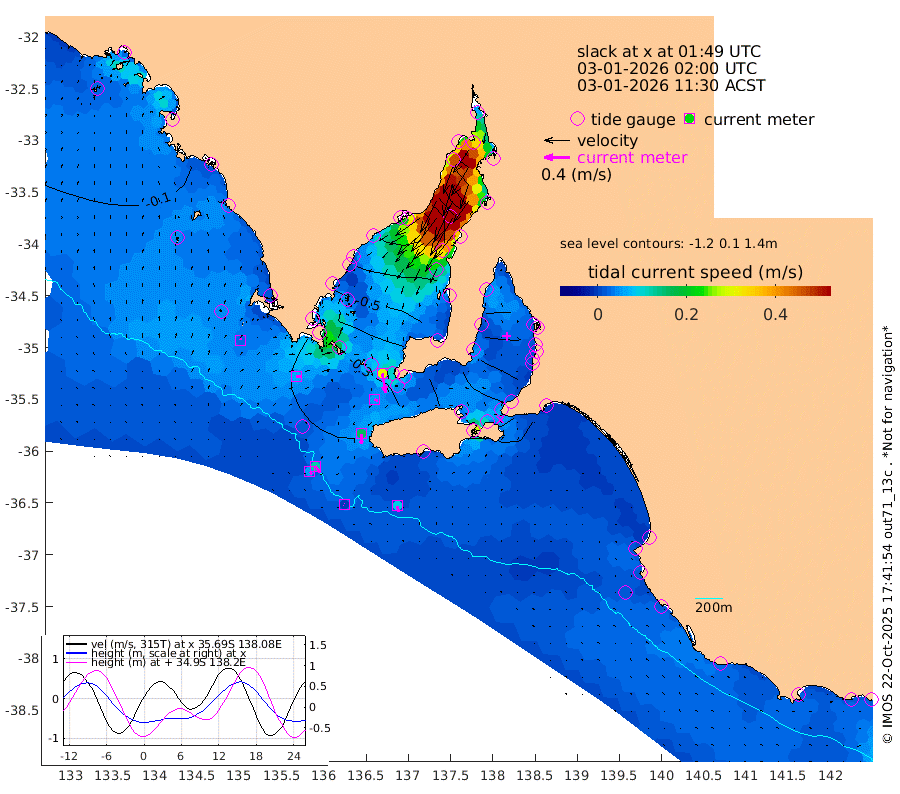 0cm/s -51T +10cm/s rms + 5cm/s 114T. SAM1DS 520m 6cm/s 90T +13cm/s rms + 5cm/s -36T. SAM2CP 100m 12cm/s 142T +21cm/s rms + 18cm/s 142T. SAM3MS 168m 9cm/s 164T +22cm/s rms + 0cm/s -30T. SAM4CY 117m 3cm/s 33T +23cm/s rms + 2cm/s 99T. SAM5CB 94m 6cm/s 117T +8cm/s rms + 3cm/s -172T. SAM6IS 83m 5cm/s 147T +11cm/s rms + 7cm/s 150T. SAM7DS 519m 31cm/s 170T +10cm/s rms + 2cm/s 87T. SAM8SG 47m 16cm/s -177T +20cm/s rms + 12cm/s -168T. NRSKAI 101m -24cm Warrnambool -24cm Port Fairy -23cm Portland -24cm Port Macdonnell -22cm Beachport -21cm Cape Rabelais (off) -20cm Robe -21cm Cape Jaffa -20cm Kingston -29cm Victor Harbor -21cm Vivonne Bay -62cm Kingscote -57cm American River -56cm Penneshaw -58cm Cape Jervis -72cm Second Valley -83cm Port Noarlunga -86cm Port Stanvac -86cm Brighton -89cm Glenelg -97cm Port Adelaide (Outer Harbor) -95cm Angus Inlet (Garden Island) -112cm Ardrossan -89cm Port Vincent -85cm Port Giles -33cm Stenhouse Bay -36cm Althorpe Island -26cm Pondalowie Bay -49cm Point Turton -50cm Port Victoria -56cm Cape Elizabeth -61cm Tiparra Reef Light -64cm Wallaroo -76cm Middle Bank 9cm Port Broughton -56cm Port Pirie -69cm Red Cliff Point (Beacon 5) -70cm Port Bonython -77cm Whyalla -76cm Western Shoal Beacon -68cm Franklin Harbor -82cm Franklin Harbor Entrance Beacon -71cm Arno Bay -69cm Port Neill -62cm Cape Hardy -57cm Tumby Bay -53cm Reevesby Island -46cm Port Lincoln -34cm Taylors Landing -44cm Whalers Bay -35cm Wedge Island Mooring -23cm Shelf Edge Mooring -21cm Coffin Bay Entrance Beacon -20cm Greenly Island -18cm Elliston -14cm Pearson Island -15cm Venus Bay -12cm Blanche Port (Streaky Bay) -12cm Thevenard -13cm St Francis Island