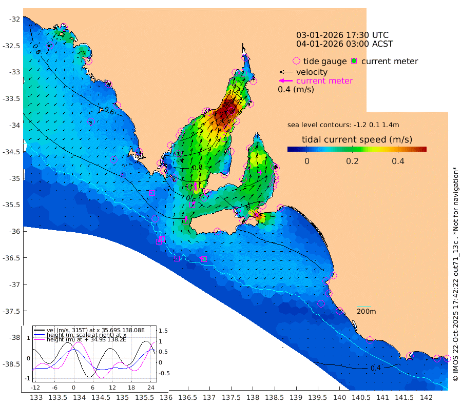 1cm/s -67T +10cm/s rms + 5cm/s 114T. SAM1DS 520m 5cm/s -85T +13cm/s rms + 5cm/s -36T. SAM2CP 100m 8cm/s -43T +21cm/s rms + 18cm/s 142T. SAM3MS 168m 14cm/s -65T +22cm/s rms + 0cm/s -30T. SAM4CY 117m 4cm/s -116T +23cm/s rms + 2cm/s 99T. SAM5CB 94m 12cm/s 42T +8cm/s rms + 3cm/s -172T. SAM6IS 83m 3cm/s -39T +11cm/s rms + 7cm/s 150T. SAM7DS 519m 28cm/s -6T +10cm/s rms + 2cm/s 87T. SAM8SG 47m 19cm/s 7T +20cm/s rms + 12cm/s -168T. NRSKAI 101m 43cm Warrnambool 43cm Port Fairy 43cm Portland 49cm Port Macdonnell 43cm Beachport 46cm Cape Rabelais (off) 46cm Robe 54cm Cape Jaffa 50cm Kingston 55cm Victor Harbor 40cm Vivonne Bay 80cm Kingscote 70cm American River 75cm Penneshaw 68cm Cape Jervis 76cm Second Valley 86cm Port Noarlunga 88cm Port Stanvac 87cm Brighton 92cm Glenelg 92cm Port Adelaide (Outer Harbor) 68cm Angus Inlet (Garden Island) 105cm Ardrossan 110cm Port Vincent 97cm Port Giles 65cm Stenhouse Bay 68cm Althorpe Island 59cm Pondalowie Bay 86cm Point Turton 85cm Port Victoria 88cm Cape Elizabeth 85cm Tiparra Reef Light 77cm Wallaroo 81cm Middle Bank 22cm Port Broughton 24cm Port Pirie 16cm Red Cliff Point (Beacon 5) 33cm Port Bonython 46cm Whyalla 54cm Western Shoal Beacon 84cm Franklin Harbor 107cm Franklin Harbor Entrance Beacon 102cm Arno Bay 109cm Port Neill 101cm Cape Hardy 98cm Tumby Bay 91cm Reevesby Island 87cm Port Lincoln 71cm Taylors Landing 80cm Whalers Bay 69cm Wedge Island Mooring 48cm Shelf Edge Mooring 61cm Coffin Bay Entrance Beacon 48cm Greenly Island 60cm Elliston 52cm Pearson Island 55cm Venus Bay 78cm Blanche Port (Streaky Bay) 73cm Thevenard 56cm St Francis Island