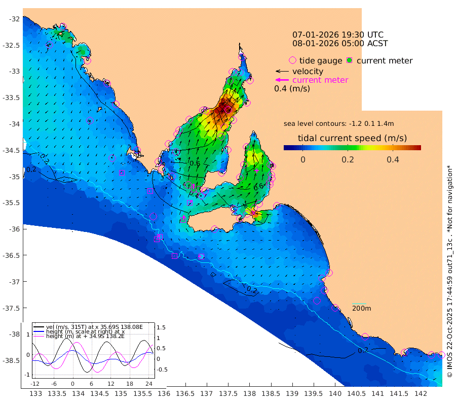1cm/s -51T +10cm/s rms + 5cm/s 114T. SAM1DS 520m 3cm/s -90T +13cm/s rms + 5cm/s -36T. SAM2CP 100m 6cm/s -35T +21cm/s rms + 18cm/s 142T. SAM3MS 168m 8cm/s -74T +22cm/s rms + 0cm/s -30T. SAM4CY 117m 4cm/s -142T +23cm/s rms + 2cm/s 99T. SAM5CB 94m 7cm/s 47T +8cm/s rms + 3cm/s -172T. SAM6IS 83m 2cm/s -23T +11cm/s rms + 7cm/s 150T. SAM7DS 519m 17cm/s -1T +10cm/s rms + 2cm/s 87T. SAM8SG 47m 14cm/s 8T +20cm/s rms + 12cm/s -168T. NRSKAI 101m 19cm Warrnambool 21cm Port Fairy 20cm Portland 29cm Port Macdonnell 20cm Beachport 22cm Cape Rabelais (off) 22cm Robe 28cm Cape Jaffa 27cm Kingston 29cm Victor Harbor 18cm Vivonne Bay 56cm Kingscote 48cm American River 53cm Penneshaw 45cm Cape Jervis 56cm Second Valley 67cm Port Noarlunga 68cm Port Stanvac 67cm Brighton 72cm Glenelg 74cm Port Adelaide (Outer Harbor) 47cm Angus Inlet (Garden Island) 88cm Ardrossan 95cm Port Vincent 79cm Port Giles 43cm Stenhouse Bay 42cm Althorpe Island 37cm Pondalowie Bay 59cm Point Turton 58cm Port Victoria 64cm Cape Elizabeth 52cm Tiparra Reef Light 40cm Wallaroo 42cm Middle Bank 1cm Port Broughton -27cm Port Pirie -30cm Red Cliff Point (Beacon 5) -13cm Port Bonython -3cm Whyalla 4cm Western Shoal Beacon 56cm Franklin Harbor 74cm Franklin Harbor Entrance Beacon 71cm Arno Bay 80cm Port Neill 72cm Cape Hardy 69cm Tumby Bay 58cm Reevesby Island 57cm Port Lincoln 44cm Taylors Landing 52cm Whalers Bay 43cm Wedge Island Mooring 24cm Shelf Edge Mooring 33cm Coffin Bay Entrance Beacon 22cm Greenly Island 31cm Elliston 26cm Pearson Island 31cm Venus Bay 44cm Blanche Port (Streaky Bay) 38cm Thevenard 23cm St Francis Island