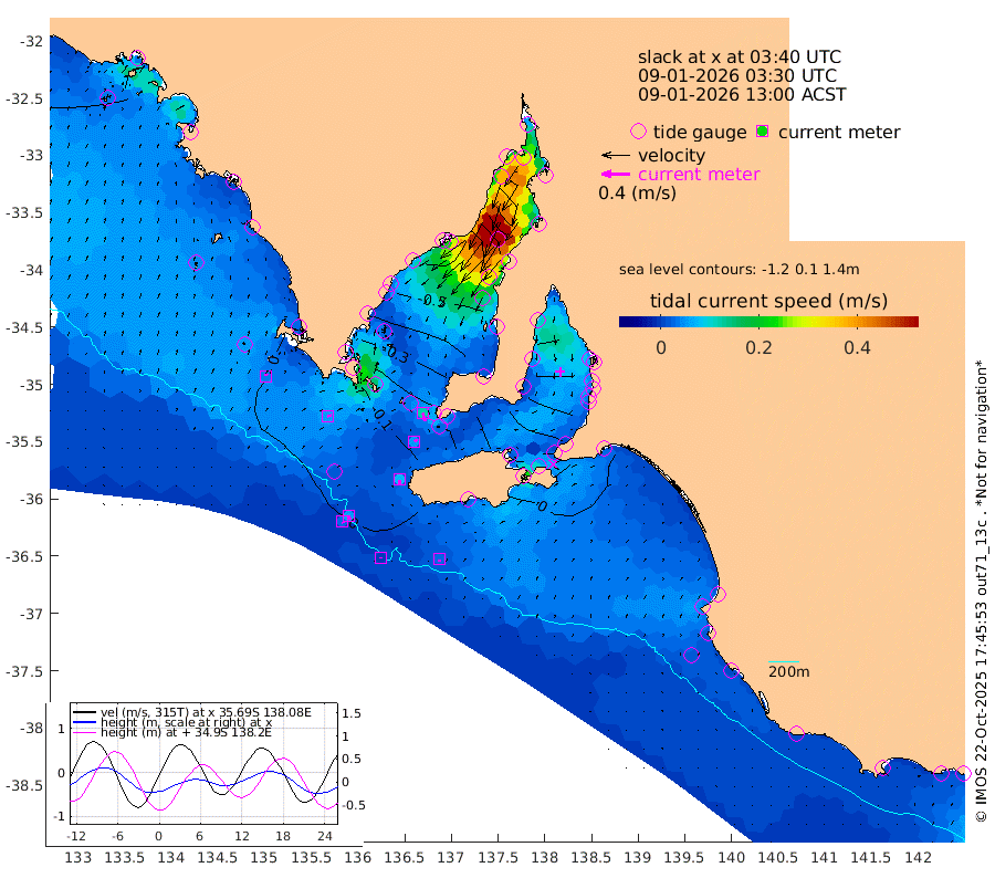 0cm/s 2T +10cm/s rms + 5cm/s 114T. SAM1DS 520m 5cm/s 80T +13cm/s rms + 5cm/s -36T. SAM2CP 100m 6cm/s 158T +21cm/s rms + 18cm/s 142T. SAM3MS 168m 3cm/s 166T +22cm/s rms + 0cm/s -30T. SAM4CY 117m 4cm/s 27T +23cm/s rms + 2cm/s 99T. SAM5CB 94m 5cm/s 66T +8cm/s rms + 3cm/s -172T. SAM6IS 83m 3cm/s 158T +11cm/s rms + 7cm/s 150T. SAM7DS 519m 12cm/s 161T +10cm/s rms + 2cm/s 87T. SAM8SG 47m 7cm/s -179T +20cm/s rms + 12cm/s -168T. NRSKAI 101m 6cm Warrnambool 5cm Port Fairy 4cm Portland -2cm Port Macdonnell 3cm Beachport 3cm Cape Rabelais (off) 2cm Robe 1cm Cape Jaffa 2cm Kingston -5cm Victor Harbor 1cm Vivonne Bay -48cm Kingscote -46cm American River -41cm Penneshaw -43cm Cape Jervis -59cm Second Valley -73cm Port Noarlunga -76cm Port Stanvac -77cm Brighton -79cm Glenelg -88cm Port Adelaide (Outer Harbor) -74cm Angus Inlet (Garden Island) -109cm Ardrossan -94cm Port Vincent -79cm Port Giles -20cm Stenhouse Bay -20cm Althorpe Island -13cm Pondalowie Bay -32cm Point Turton -30cm Port Victoria -38cm Cape Elizabeth -37cm Tiparra Reef Light -32cm Wallaroo -38cm Middle Bank 10cm Port Broughton 3cm Port Pirie -6cm Red Cliff Point (Beacon 5) -8cm Port Bonython -20cm Whyalla -27cm Western Shoal Beacon -42cm Franklin Harbor -52cm Franklin Harbor Entrance Beacon -47cm Arno Bay -47cm Port Neill -44cm Cape Hardy -39cm Tumby Bay -32cm Reevesby Island -26cm Port Lincoln -15cm Taylors Landing -28cm Whalers Bay -15cm Wedge Island Mooring -1cm Shelf Edge Mooring -1cm Coffin Bay Entrance Beacon 3cm Greenly Island 0cm Elliston 4cm Pearson Island -4cm Venus Bay 1cm Blanche Port (Streaky Bay) 4cm Thevenard 5cm St Francis Island