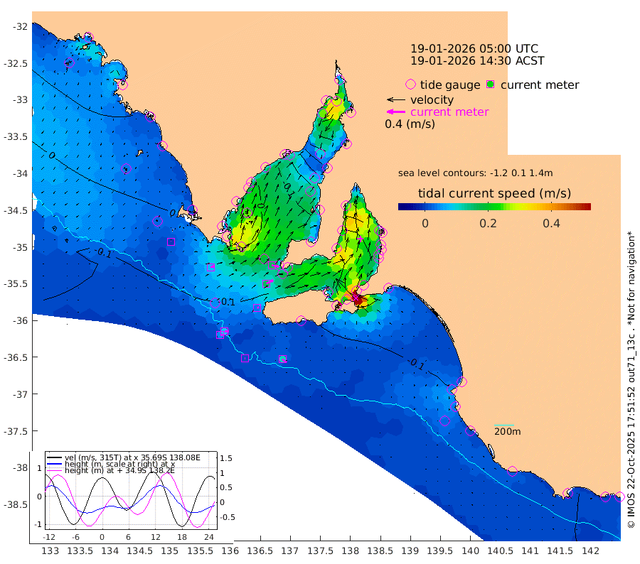 1cm/s 87T +10cm/s rms + 5cm/s 114T. SAM1DS 520m 7cm/s 71T +13cm/s rms + 5cm/s -36T. SAM2CP 100m 9cm/s 92T +21cm/s rms + 18cm/s 142T. SAM3MS 168m 11cm/s 127T +22cm/s rms + 0cm/s -30T. SAM4CY 117m 0cm/s 116T +23cm/s rms + 2cm/s 99T. SAM5CB 94m 16cm/s 63T +8cm/s rms + 3cm/s -172T. SAM6IS 83m 4cm/s 94T +11cm/s rms + 7cm/s 150T. SAM7DS 519m 16cm/s 103T +10cm/s rms + 2cm/s 87T. SAM8SG 47m 4cm/s 60T +20cm/s rms + 12cm/s -168T. NRSKAI 101m -25cm Warrnambool -22cm Port Fairy -21cm Portland -18cm Port Macdonnell -19cm Beachport -19cm Cape Rabelais (off) -17cm Robe -16cm Cape Jaffa -15cm Kingston -17cm Victor Harbor -12cm Vivonne Bay -29cm Kingscote -33cm American River -21cm Penneshaw -30cm Cape Jervis -41cm Second Valley -38cm Port Noarlunga -39cm Port Stanvac -40cm Brighton -38cm Glenelg -44cm Port Adelaide (Outer Harbor) -71cm Angus Inlet (Garden Island) -43cm Ardrossan -19cm Port Vincent -26cm Port Giles -7cm Stenhouse Bay -15cm Althorpe Island -10cm Pondalowie Bay -20cm Point Turton -17cm Port Victoria -26cm Cape Elizabeth -42cm Tiparra Reef Light -68cm Wallaroo -77cm Middle Bank -59cm Port Broughton -152cm Port Pirie -169cm Red Cliff Point (Beacon 5) -146cm Port Bonython -143cm Whyalla -127cm Western Shoal Beacon -51cm Franklin Harbor -35cm Franklin Harbor Entrance Beacon -21cm Arno Bay -14cm Port Neill -13cm Cape Hardy -8cm Tumby Bay -7cm Reevesby Island -1cm Port Lincoln -3cm Taylors Landing -12cm Whalers Bay -10cm Wedge Island Mooring -15cm Shelf Edge Mooring -3cm Coffin Bay Entrance Beacon -5cm Greenly Island 0cm Elliston 1cm Pearson Island 0cm Venus Bay 18cm Blanche Port (Streaky Bay) 19cm Thevenard 10cm St Francis Island