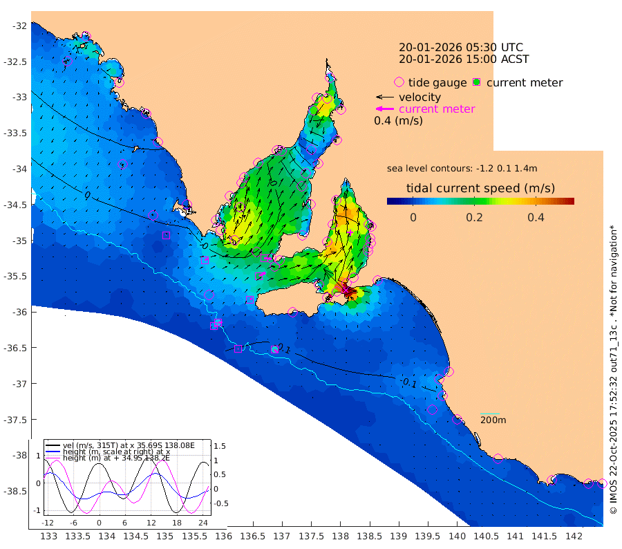 1cm/s 91T +10cm/s rms + 5cm/s 114T. SAM1DS 520m 7cm/s 69T +13cm/s rms + 5cm/s -36T. SAM2CP 100m 9cm/s 89T +21cm/s rms + 18cm/s 142T. SAM3MS 168m 11cm/s 128T +22cm/s rms + 0cm/s -30T. SAM4CY 117m 0cm/s -143T +23cm/s rms + 2cm/s 99T. SAM5CB 94m 16cm/s 63T +8cm/s rms + 3cm/s -172T. SAM6IS 83m 4cm/s 90T +11cm/s rms + 7cm/s 150T. SAM7DS 519m 16cm/s 95T +10cm/s rms + 2cm/s 87T. SAM8SG 47m 5cm/s 43T +20cm/s rms + 12cm/s -168T. NRSKAI 101m -21cm Warrnambool -18cm Port Fairy -18cm Portland -14cm Port Macdonnell -15cm Beachport -15cm Cape Rabelais (off) -13cm Robe -13cm Cape Jaffa -10cm Kingston -13cm Victor Harbor -9cm Vivonne Bay -24cm Kingscote -28cm American River -15cm Penneshaw -26cm Cape Jervis -36cm Second Valley -32cm Port Noarlunga -33cm Port Stanvac -35cm Brighton -31cm Glenelg -38cm Port Adelaide (Outer Harbor) -67cm Angus Inlet (Garden Island) -36cm Ardrossan -10cm Port Vincent -18cm Port Giles -1cm Stenhouse Bay -10cm Althorpe Island -5cm Pondalowie Bay -12cm Point Turton -10cm Port Victoria -20cm Cape Elizabeth -35cm Tiparra Reef Light -63cm Wallaroo -72cm Middle Bank -60cm Port Broughton -155cm Port Pirie -172cm Red Cliff Point (Beacon 5) -145cm Port Bonython -143cm Whyalla -127cm Western Shoal Beacon -45cm Franklin Harbor -26cm Franklin Harbor Entrance Beacon -12cm Arno Bay -3cm Port Neill -6cm Cape Hardy -1cm Tumby Bay 1cm Reevesby Island 7cm Port Lincoln 3cm Taylors Landing -6cm Whalers Bay -5cm Wedge Island Mooring -11cm Shelf Edge Mooring 2cm Coffin Bay Entrance Beacon -2cm Greenly Island 4cm Elliston 4cm Pearson Island 5cm Venus Bay 24cm Blanche Port (Streaky Bay) 24cm Thevenard 12cm St Francis Island