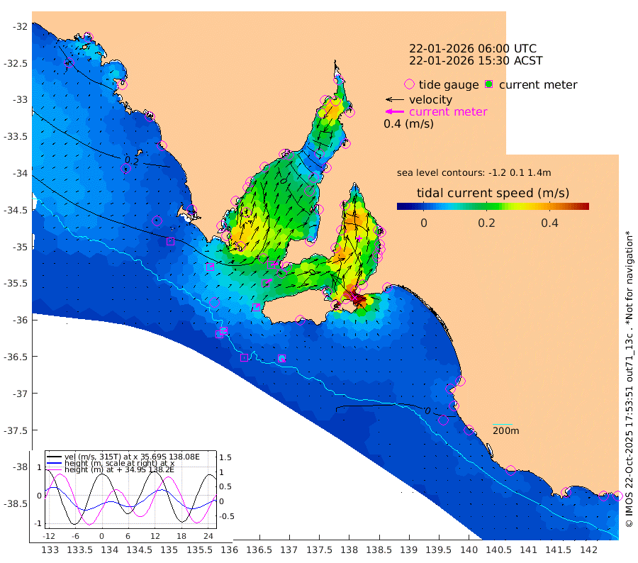 1cm/s 94T +10cm/s rms + 5cm/s 114T. SAM1DS 520m 8cm/s 63T +13cm/s rms + 5cm/s -36T. SAM2CP 100m 8cm/s 90T +21cm/s rms + 18cm/s 142T. SAM3MS 168m 8cm/s 135T +22cm/s rms + 0cm/s -30T. SAM4CY 117m 1cm/s -54T +23cm/s rms + 2cm/s 99T. SAM5CB 94m 16cm/s 60T +8cm/s rms + 3cm/s -172T. SAM6IS 83m 4cm/s 89T +11cm/s rms + 7cm/s 150T. SAM7DS 519m 16cm/s 81T +10cm/s rms + 2cm/s 87T. SAM8SG 47m 9cm/s 30T +20cm/s rms + 12cm/s -168T. NRSKAI 101m -5cm Warrnambool -4cm Port Fairy -3cm Portland 1cm Port Macdonnell -1cm Beachport 0cm Cape Rabelais (off) 2cm Robe 1cm Cape Jaffa 5cm Kingston 1cm Victor Harbor 4cm Vivonne Bay -21cm Kingscote -23cm American River -9cm Penneshaw -21cm Cape Jervis -35cm Second Valley -33cm Port Noarlunga -34cm Port Stanvac -38cm Brighton -33cm Glenelg -42cm Port Adelaide (Outer Harbor) -68cm Angus Inlet (Garden Island) -43cm Ardrossan -15cm Port Vincent -19cm Port Giles 10cm Stenhouse Bay 2cm Althorpe Island 7cm Pondalowie Bay -1cm Point Turton -1cm Port Victoria -12cm Cape Elizabeth -21cm Tiparra Reef Light -49cm Wallaroo -59cm Middle Bank -45cm Port Broughton -134cm Port Pirie -156cm Red Cliff Point (Beacon 5) -122cm Port Bonython -125cm Whyalla -111cm Western Shoal Beacon -38cm Franklin Harbor -17cm Franklin Harbor Entrance Beacon -1cm Arno Bay 10cm Port Neill 5cm Cape Hardy 10cm Tumby Bay 12cm Reevesby Island 19cm Port Lincoln 16cm Taylors Landing 3cm Whalers Bay 8cm Wedge Island Mooring 3cm Shelf Edge Mooring 16cm Coffin Bay Entrance Beacon 9cm Greenly Island 17cm Elliston 18cm Pearson Island 16cm Venus Bay 39cm Blanche Port (Streaky Bay) 39cm Thevenard 24cm St Francis Island