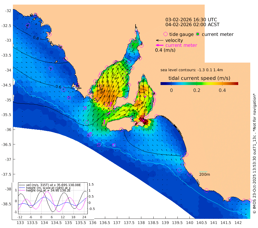 1cm/s -53T +10cm/s rms + 5cm/s 114T. SAM1DS 520m 6cm/s 36T +13cm/s rms + 5cm/s -36T. SAM2CP 100m 7cm/s 6T +21cm/s rms + 18cm/s 142T. SAM3MS 168m 7cm/s -44T +22cm/s rms + 0cm/s -30T. SAM4CY 117m 3cm/s -38T +23cm/s rms + 2cm/s 99T. SAM5CB 94m 21cm/s 50T +8cm/s rms + 3cm/s -172T. SAM6IS 83m 3cm/s 1T +11cm/s rms + 7cm/s 150T. SAM7DS 519m 30cm/s 19T +10cm/s rms + 2cm/s 87T. SAM8SG 47m 26cm/s 12T +20cm/s rms + 12cm/s -168T. NRSKAI 101m 42cm Warrnambool 42cm Port Fairy 43cm Portland 46cm Port Macdonnell 44cm Beachport 47cm Cape Rabelais (off) 46cm Robe 52cm Cape Jaffa 51cm Kingston 51cm Victor Harbor 46cm Vivonne Bay 21cm Kingscote 16cm American River 33cm Penneshaw 17cm Cape Jervis 5cm Second Valley -2cm Port Noarlunga -4cm Port Stanvac -7cm Brighton -5cm Glenelg -14cm Port Adelaide (Outer Harbor) -45cm Angus Inlet (Garden Island) -19cm Ardrossan 15cm Port Vincent 11cm Port Giles 46cm Stenhouse Bay 47cm Althorpe Island 43cm Pondalowie Bay 43cm Point Turton 41cm Port Victoria 41cm Cape Elizabeth 29cm Tiparra Reef Light 7cm Wallaroo 4cm Middle Bank -14cm Port Broughton -62cm Port Pirie -72cm Red Cliff Point (Beacon 5) -57cm Port Bonython -52cm Whyalla -41cm Western Shoal Beacon 13cm Franklin Harbor 44cm Franklin Harbor Entrance Beacon 53cm Arno Bay 66cm Port Neill 65cm Cape Hardy 69cm Tumby Bay 62cm Reevesby Island 68cm Port Lincoln 64cm Taylors Landing 47cm Whalers Bay 55cm Wedge Island Mooring 48cm Shelf Edge Mooring 65cm Coffin Bay Entrance Beacon 53cm Greenly Island 66cm Elliston 62cm Pearson Island 53cm Venus Bay 91cm Blanche Port (Streaky Bay) 88cm Thevenard 72cm St Francis Island