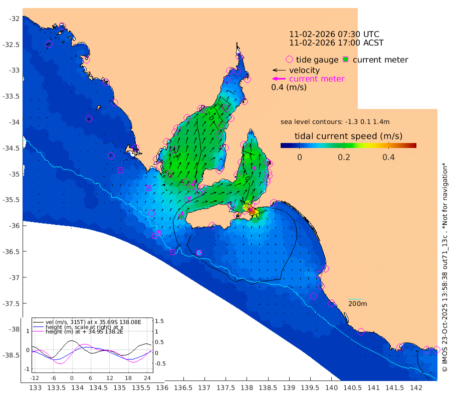 1cm/s 66T +10cm/s rms + 5cm/s 114T. SAM1DS 520m 5cm/s 42T +13cm/s rms + 5cm/s -36T. SAM2CP 100m 6cm/s 22T +21cm/s rms + 18cm/s 142T. SAM3MS 168m 7cm/s 66T +22cm/s rms + 0cm/s -30T. SAM4CY 117m 1cm/s -40T +23cm/s rms + 2cm/s 99T. SAM5CB 94m 12cm/s 44T +8cm/s rms + 3cm/s -172T. SAM6IS 83m 3cm/s 28T +11cm/s rms + 7cm/s 150T. SAM7DS 519m 21cm/s 26T +10cm/s rms + 2cm/s 87T. SAM8SG 47m 16cm/s 13T +20cm/s rms + 12cm/s -168T. NRSKAI 101m 13cm Warrnambool 11cm Port Fairy 12cm Portland 10cm Port Macdonnell 12cm Beachport 12cm Cape Rabelais (off) 11cm Robe 8cm Cape Jaffa 12cm Kingston 13cm Victor Harbor 16cm Vivonne Bay -1cm Kingscote -3cm American River 9cm Penneshaw 0cm Cape Jervis -7cm Second Valley -6cm Port Noarlunga -5cm Port Stanvac -8cm Brighton -4cm Glenelg -8cm Port Adelaide (Outer Harbor) -19cm Angus Inlet (Garden Island) -6cm Ardrossan -4cm Port Vincent 4cm Port Giles 14cm Stenhouse Bay 10cm Althorpe Island 9cm Pondalowie Bay 8cm Point Turton 7cm Port Victoria 2cm Cape Elizabeth 2cm Tiparra Reef Light -16cm Wallaroo -16cm Middle Bank -46cm Port Broughton -64cm Port Pirie -68cm Red Cliff Point (Beacon 5) -46cm Port Bonython -51cm Whyalla -46cm Western Shoal Beacon -15cm Franklin Harbor 10cm Franklin Harbor Entrance Beacon 18cm Arno Bay 27cm Port Neill 19cm Cape Hardy 21cm Tumby Bay 19cm Reevesby Island 24cm Port Lincoln 21cm Taylors Landing 9cm Whalers Bay 14cm Wedge Island Mooring 13cm Shelf Edge Mooring 15cm Coffin Bay Entrance Beacon 14cm Greenly Island 14cm Elliston 15cm Pearson Island 9cm Venus Bay 18cm Blanche Port (Streaky Bay) 20cm Thevenard 15cm St Francis Island