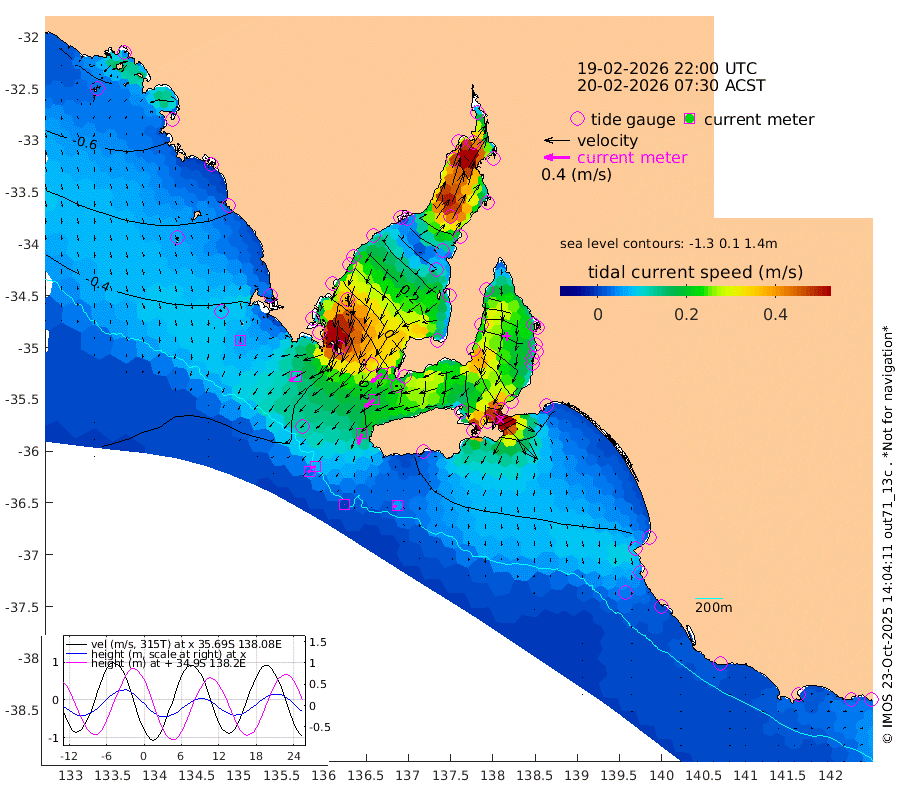 0cm/s 145T +10cm/s rms + 5cm/s 114T. SAM1DS 520m 12cm/s -127T +13cm/s rms + 5cm/s -36T. SAM2CP 100m 7cm/s -109T +21cm/s rms + 18cm/s 142T. SAM3MS 168m 5cm/s -110T +22cm/s rms + 0cm/s -30T. SAM4CY 117m 5cm/s -180T +23cm/s rms + 2cm/s 99T. SAM5CB 94m 19cm/s -127T +8cm/s rms + 3cm/s -172T. SAM6IS 83m 3cm/s -109T +11cm/s rms + 7cm/s 150T. SAM7DS 519m 22cm/s -128T +10cm/s rms + 2cm/s 87T. SAM8SG 47m 17cm/s -162T +20cm/s rms + 12cm/s -168T. NRSKAI 101m -23cm Warrnambool -22cm Port Fairy -24cm Portland -22cm Port Macdonnell -25cm Beachport -26cm Cape Rabelais (off) -27cm Robe -28cm Cape Jaffa -31cm Kingston -26cm Victor Harbor -31cm Vivonne Bay 42cm Kingscote 38cm American River 19cm Penneshaw 34cm Cape Jervis 59cm Second Valley 78cm Port Noarlunga 82cm Port Stanvac 86cm Brighton 85cm Glenelg 100cm Port Adelaide (Outer Harbor) 119cm Angus Inlet (Garden Island) 120cm Ardrossan 81cm Port Vincent 69cm Port Giles -11cm Stenhouse Bay -10cm Althorpe Island -12cm Pondalowie Bay 9cm Point Turton 13cm Port Victoria 20cm Cape Elizabeth 24cm Tiparra Reef Light 47cm Wallaroo 57cm Middle Bank 31cm Port Broughton 89cm Port Pirie 101cm Red Cliff Point (Beacon 5) 96cm Port Bonython 97cm Whyalla 84cm Western Shoal Beacon 49cm Franklin Harbor 27cm Franklin Harbor Entrance Beacon 11cm Arno Bay 2cm Port Neill -2cm Cape Hardy -11cm Tumby Bay -14cm Reevesby Island -24cm Port Lincoln -30cm Taylors Landing -2cm Whalers Bay -19cm Wedge Island Mooring -28cm Shelf Edge Mooring -42cm Coffin Bay Entrance Beacon -35cm Greenly Island -45cm Elliston -42cm Pearson Island -32cm Venus Bay -67cm Blanche Port (Streaky Bay) -69cm Thevenard -56cm St Francis Island