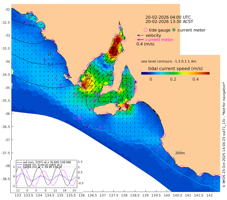 0cm/s 14T +10cm/s rms + 5cm/s 114T. SAM1DS 520m 11cm/s 59T +13cm/s rms + 5cm/s -36T. SAM2CP 100m 7cm/s 108T +21cm/s rms + 18cm/s 142T. SAM3MS 168m 3cm/s 136T +22cm/s rms + 0cm/s -30T. SAM4CY 117m 5cm/s -4T +23cm/s rms + 2cm/s 99T. SAM5CB 94m 17cm/s 56T +8cm/s rms + 3cm/s -172T. SAM6IS 83m 3cm/s 104T +11cm/s rms + 7cm/s 150T. SAM7DS 519m 15cm/s 72T +10cm/s rms + 2cm/s 87T. SAM8SG 47m 10cm/s 26T +20cm/s rms + 12cm/s -168T. NRSKAI 101m 24cm Warrnambool 23cm Port Fairy 24cm Portland 23cm Port Macdonnell 24cm Beachport 27cm Cape Rabelais (off) 26cm Robe 26cm Cape Jaffa 29cm Kingston 22cm Victor Harbor 28cm Vivonne Bay -44cm Kingscote -41cm American River -24cm Penneshaw -38cm Cape Jervis -64cm Second Valley -80cm Port Noarlunga -84cm Port Stanvac -89cm Brighton -88cm Glenelg -103cm Port Adelaide (Outer Harbor) -114cm Angus Inlet (Garden Island) -123cm Ardrossan -86cm Port Vincent -74cm Port Giles 10cm Stenhouse Bay 7cm Althorpe Island 13cm Pondalowie Bay -9cm Point Turton -12cm Port Victoria -24cm Cape Elizabeth -26cm Tiparra Reef Light -45cm Wallaroo -57cm Middle Bank -13cm Port Broughton -78cm Port Pirie -104cm Red Cliff Point (Beacon 5) -81cm Port Bonython -91cm Whyalla -84cm Western Shoal Beacon -54cm Franklin Harbor -37cm Franklin Harbor Entrance Beacon -18cm Arno Bay -8cm Port Neill -5cm Cape Hardy 3cm Tumby Bay 8cm Reevesby Island 18cm Port Lincoln 25cm Taylors Landing -2cm Whalers Bay 16cm Wedge Island Mooring 26cm Shelf Edge Mooring 38cm Coffin Bay Entrance Beacon 33cm Greenly Island 40cm Elliston 45cm Pearson Island 30cm Venus Bay 62cm Blanche Port (Streaky Bay) 63cm Thevenard 55cm St Francis Island