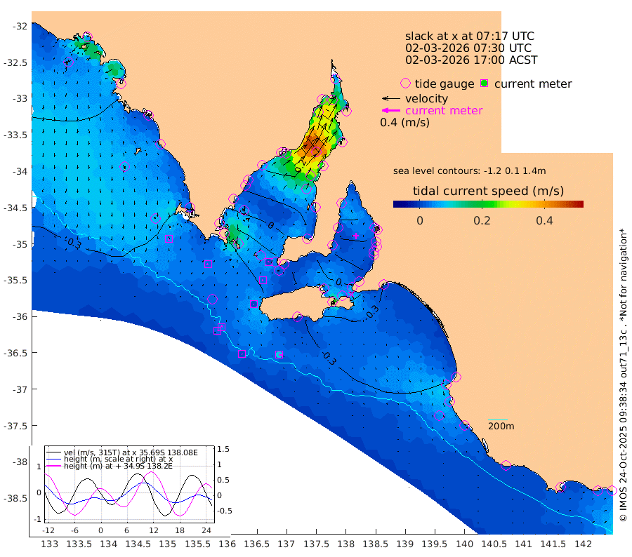 1cm/s 124T +10cm/s rms + 5cm/s 114T. SAM1DS 520m 3cm/s -123T +13cm/s rms + 5cm/s -36T. SAM2CP 100m 4cm/s 21T +21cm/s rms + 18cm/s 142T. SAM3MS 168m 9cm/s 94T +22cm/s rms + 0cm/s -30T. SAM4CY 117m 4cm/s -177T +23cm/s rms + 2cm/s 99T. SAM5CB 94m 3cm/s -109T +8cm/s rms + 3cm/s -172T. SAM6IS 83m 2cm/s 43T +11cm/s rms + 7cm/s 150T. SAM7DS 519m 1cm/s 33T +10cm/s rms + 2cm/s 87T. SAM8SG 47m 1cm/s -162T +20cm/s rms + 12cm/s -168T. NRSKAI 101m -28cm Warrnambool -29cm Port Fairy -30cm Portland -30cm Port Macdonnell -29cm Beachport -31cm Cape Rabelais (off) -30cm Robe -34cm Cape Jaffa -31cm Kingston -27cm Victor Harbor -27cm Vivonne Bay 9cm Kingscote 6cm American River 4cm Penneshaw 9cm Cape Jervis 19cm Second Valley 35cm Port Noarlunga 39cm Port Stanvac 38cm Brighton 42cm Glenelg 49cm Port Adelaide (Outer Harbor) 45cm Angus Inlet (Garden Island) 66cm Ardrossan 42cm Port Vincent 39cm Port Giles -13cm Stenhouse Bay -16cm Althorpe Island -18cm Pondalowie Bay -6cm Point Turton -5cm Port Victoria -4cm Cape Elizabeth -2cm Tiparra Reef Light -9cm Wallaroo -5cm Middle Bank -45cm Port Broughton -41cm Port Pirie -29cm Red Cliff Point (Beacon 5) -25cm Port Bonython -21cm Whyalla -15cm Western Shoal Beacon 1cm Franklin Harbor 8cm Franklin Harbor Entrance Beacon 5cm Arno Bay 5cm Port Neill -1cm Cape Hardy -5cm Tumby Bay -8cm Reevesby Island -12cm Port Lincoln -21cm Taylors Landing -9cm Whalers Bay -20cm Wedge Island Mooring -29cm Shelf Edge Mooring -32cm Coffin Bay Entrance Beacon -31cm Greenly Island -35cm Elliston -38cm Pearson Island -27cm Venus Bay -44cm Blanche Port (Streaky Bay) -42cm Thevenard -42cm St Francis Island