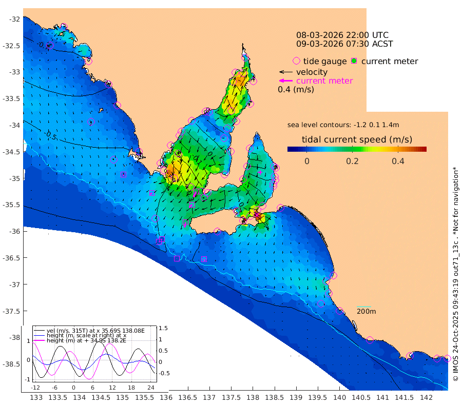 0cm/s 106T +10cm/s rms + 5cm/s 114T. SAM1DS 520m 6cm/s -130T +13cm/s rms + 5cm/s -36T. SAM2CP 100m 1cm/s -154T +21cm/s rms + 18cm/s 142T. SAM3MS 168m 5cm/s 148T +22cm/s rms + 0cm/s -30T. SAM4CY 117m 4cm/s 174T +23cm/s rms + 2cm/s 99T. SAM5CB 94m 12cm/s -132T +8cm/s rms + 3cm/s -172T. SAM6IS 83m 1cm/s -124T +11cm/s rms + 7cm/s 150T. SAM7DS 519m 18cm/s -155T +10cm/s rms + 2cm/s 87T. SAM8SG 47m 15cm/s -166T +20cm/s rms + 12cm/s -168T. NRSKAI 101m -48cm Warrnambool -45cm Port Fairy -46cm Portland -43cm Port Macdonnell -43cm Beachport -44cm Cape Rabelais (off) -45cm Robe -48cm Cape Jaffa -48cm Kingston -44cm Victor Harbor -43cm Vivonne Bay 18cm Kingscote 13cm American River -2cm Penneshaw 11cm Cape Jervis 32cm Second Valley 51cm Port Noarlunga 53cm Port Stanvac 58cm Brighton 58cm Glenelg 70cm Port Adelaide (Outer Harbor) 78cm Angus Inlet (Garden Island) 91cm Ardrossan 63cm Port Vincent 46cm Port Giles -25cm Stenhouse Bay -29cm Althorpe Island -28cm Pondalowie Bay -18cm Point Turton -15cm Port Victoria -9cm Cape Elizabeth -12cm Tiparra Reef Light -2cm Wallaroo 3cm Middle Bank -5cm Port Broughton 6cm Port Pirie 15cm Red Cliff Point (Beacon 5) 18cm Port Bonython 18cm Whyalla 12cm Western Shoal Beacon 5cm Franklin Harbor -9cm Franklin Harbor Entrance Beacon -16cm Arno Bay -23cm Port Neill -23cm Cape Hardy -29cm Tumby Bay -34cm Reevesby Island -40cm Port Lincoln -42cm Taylors Landing -23cm Whalers Bay -36cm Wedge Island Mooring -42cm Shelf Edge Mooring -54cm Coffin Bay Entrance Beacon -48cm Greenly Island -55cm Elliston -50cm Pearson Island -43cm Venus Bay -73cm Blanche Port (Streaky Bay) -74cm Thevenard -66cm St Francis Island