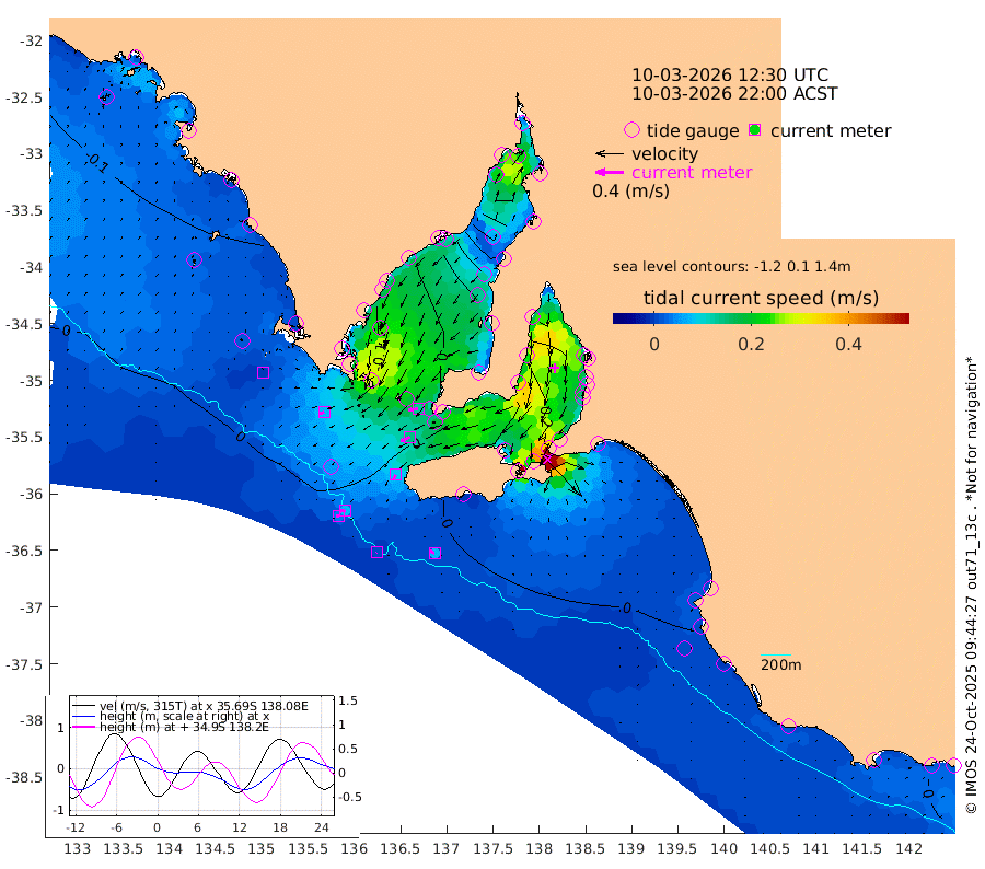 1cm/s -128T +10cm/s rms + 5cm/s 114T. SAM1DS 520m 7cm/s -115T +13cm/s rms + 5cm/s -36T. SAM2CP 100m 8cm/s -99T +21cm/s rms + 18cm/s 142T. SAM3MS 168m 7cm/s -57T +22cm/s rms + 0cm/s -30T. SAM4CY 117m 0cm/s 138T +23cm/s rms + 2cm/s 99T. SAM5CB 94m 14cm/s -115T +8cm/s rms + 3cm/s -172T. SAM6IS 83m 4cm/s -97T +11cm/s rms + 7cm/s 150T. SAM7DS 519m 13cm/s -99T +10cm/s rms + 2cm/s 87T. SAM8SG 47m 8cm/s -155T +20cm/s rms + 12cm/s -168T. NRSKAI 101m 3cm Warrnambool 4cm Port Fairy 5cm Portland 3cm Port Macdonnell 5cm Beachport 4cm Cape Rabelais (off) 3cm Robe 5cm Cape Jaffa 3cm Kingston 5cm Victor Harbor 0cm Vivonne Bay 25cm Kingscote 28cm American River 14cm Penneshaw 25cm Cape Jervis 35cm Second Valley 36cm Port Noarlunga 36cm Port Stanvac 38cm Brighton 36cm Glenelg 43cm Port Adelaide (Outer Harbor) 65cm Angus Inlet (Garden Island) 44cm Ardrossan 33cm Port Vincent 23cm Port Giles -2cm Stenhouse Bay 5cm Althorpe Island 2cm Pondalowie Bay 8cm Point Turton 10cm Port Victoria 19cm Cape Elizabeth 28cm Tiparra Reef Light 53cm Wallaroo 60cm Middle Bank 51cm Port Broughton 132cm Port Pirie 147cm Red Cliff Point (Beacon 5) 120cm Port Bonython 120cm Whyalla 109cm Western Shoal Beacon 46cm Franklin Harbor 22cm Franklin Harbor Entrance Beacon 8cm Arno Bay -3cm Port Neill 1cm Cape Hardy -4cm Tumby Bay 2cm Reevesby Island -8cm Port Lincoln -6cm Taylors Landing 5cm Whalers Bay 2cm Wedge Island Mooring 4cm Shelf Edge Mooring -2cm Coffin Bay Entrance Beacon 0cm Greenly Island -5cm Elliston -5cm Pearson Island -2cm Venus Bay -15cm Blanche Port (Streaky Bay) -16cm Thevenard -13cm St Francis Island
