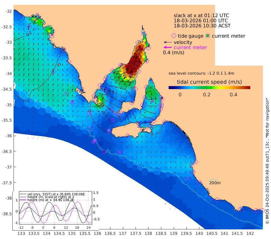 0cm/s 114T +10cm/s rms + 5cm/s 114T. SAM1DS 520m 8cm/s 64T +13cm/s rms + 5cm/s -36T. SAM2CP 100m 7cm/s 144T +21cm/s rms + 18cm/s 142T. SAM3MS 168m 4cm/s 145T +22cm/s rms + 0cm/s -30T. SAM4CY 117m 6cm/s 12T +23cm/s rms + 2cm/s 99T. SAM5CB 94m 2cm/s 110T +8cm/s rms + 3cm/s -172T. SAM6IS 83m 3cm/s 155T +11cm/s rms + 7cm/s 150T. SAM7DS 519m 13cm/s 156T +10cm/s rms + 2cm/s 87T. SAM8SG 47m 6cm/s 178T +20cm/s rms + 12cm/s -168T. NRSKAI 101m 6cm Warrnambool 5cm Port Fairy 5cm Portland 2cm Port Macdonnell 6cm Beachport 7cm Cape Rabelais (off) 5cm Robe 3cm Cape Jaffa 5cm Kingston -1cm Victor Harbor 9cm Vivonne Bay -59cm Kingscote -51cm American River -48cm Penneshaw -51cm Cape Jervis -68cm Second Valley -88cm Port Noarlunga -94cm Port Stanvac -94cm Brighton -98cm Glenelg -108cm Port Adelaide (Outer Harbor) -92cm Angus Inlet (Garden Island) -133cm Ardrossan -108cm Port Vincent -97cm Port Giles -21cm Stenhouse Bay -20cm Althorpe Island -12cm Pondalowie Bay -41cm Point Turton -46cm Port Victoria -52cm Cape Elizabeth -47cm Tiparra Reef Light -42cm Wallaroo -51cm Middle Bank 16cm Port Broughton 6cm Port Pirie -5cm Red Cliff Point (Beacon 5) -7cm Port Bonython -23cm Whyalla -30cm Western Shoal Beacon -59cm Franklin Harbor -69cm Franklin Harbor Entrance Beacon -60cm Arno Bay -59cm Port Neill -53cm Cape Hardy -46cm Tumby Bay -36cm Reevesby Island -30cm Port Lincoln -13cm Taylors Landing -35cm Whalers Bay -15cm Wedge Island Mooring 6cm Shelf Edge Mooring 6cm Coffin Bay Entrance Beacon 8cm Greenly Island 7cm Elliston 16cm Pearson Island 1cm Venus Bay 11cm Blanche Port (Streaky Bay) 14cm Thevenard 17cm St Francis Island