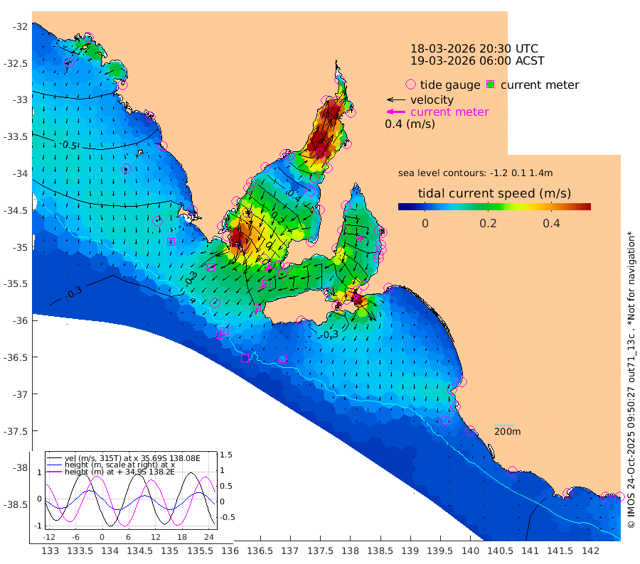 0cm/s -64T +10cm/s rms + 5cm/s 114T. SAM1DS 520m 11cm/s -127T +13cm/s rms + 5cm/s -36T. SAM2CP 100m 6cm/s -102T +21cm/s rms + 18cm/s 142T. SAM3MS 168m 5cm/s -113T +22cm/s rms + 0cm/s -30T. SAM4CY 117m 6cm/s -178T +23cm/s rms + 2cm/s 99T. SAM5CB 94m 16cm/s -130T +8cm/s rms + 3cm/s -172T. SAM6IS 83m 3cm/s -98T +11cm/s rms + 7cm/s 150T. SAM7DS 519m 19cm/s -126T +10cm/s rms + 2cm/s 87T. SAM8SG 47m 14cm/s -162T +20cm/s rms + 12cm/s -168T. NRSKAI 101m -19cm Warrnambool -20cm Port Fairy -21cm Portland -20cm Port Macdonnell -23cm Beachport -24cm Cape Rabelais (off) -24cm Robe -26cm Cape Jaffa -28cm Kingston -23cm Victor Harbor -30cm Vivonne Bay 47cm Kingscote 40cm American River 24cm Penneshaw 38cm Cape Jervis 61cm Second Valley 83cm Port Noarlunga 87cm Port Stanvac 90cm Brighton 91cm Glenelg 105cm Port Adelaide (Outer Harbor) 118cm Angus Inlet (Garden Island) 129cm Ardrossan 88cm Port Vincent 78cm Port Giles -5cm Stenhouse Bay -6cm Althorpe Island -8cm Pondalowie Bay 17cm Point Turton 20cm Port Victoria 26cm Cape Elizabeth 31cm Tiparra Reef Light 47cm Wallaroo 57cm Middle Bank 22cm Port Broughton 68cm Port Pirie 76cm Red Cliff Point (Beacon 5) 81cm Port Bonython 83cm Whyalla 72cm Western Shoal Beacon 52cm Franklin Harbor 36cm Franklin Harbor Entrance Beacon 21cm Arno Bay 13cm Port Neill 8cm Cape Hardy -2cm Tumby Bay -5cm Reevesby Island -15cm Port Lincoln -24cm Taylors Landing 5cm Whalers Bay -14cm Wedge Island Mooring -26cm Shelf Edge Mooring -39cm Coffin Bay Entrance Beacon -34cm Greenly Island -43cm Elliston -41cm Pearson Island -29cm Venus Bay -63cm Blanche Port (Streaky Bay) -65cm Thevenard -55cm St Francis Island