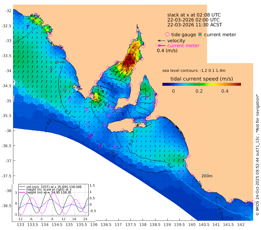 1cm/s 63T +10cm/s rms + 5cm/s 114T. SAM1DS 520m 8cm/s 56T +13cm/s rms + 5cm/s -36T. SAM2CP 100m 1cm/s 121T +21cm/s rms + 18cm/s 142T. SAM3MS 168m 4cm/s 53T +22cm/s rms + 0cm/s -30T. SAM4CY 117m 7cm/s 11T +23cm/s rms + 2cm/s 99T. SAM5CB 94m 6cm/s 38T +8cm/s rms + 3cm/s -172T. SAM6IS 83m 1cm/s -81T +11cm/s rms + 7cm/s 150T. SAM7DS 519m 10cm/s 36T +10cm/s rms + 2cm/s 87T. SAM8SG 47m 5cm/s 16T +20cm/s rms + 12cm/s -168T. NRSKAI 101m 25cm Warrnambool 24cm Port Fairy 24cm Portland 18cm Port Macdonnell 23cm Beachport 23cm Cape Rabelais (off) 21cm Robe 19cm Cape Jaffa 18cm Kingston 16cm Victor Harbor 26cm Vivonne Bay -50cm Kingscote -44cm American River -35cm Penneshaw -40cm Cape Jervis -60cm Second Valley -83cm Port Noarlunga -88cm Port Stanvac -90cm Brighton -95cm Glenelg -104cm Port Adelaide (Outer Harbor) -88cm Angus Inlet (Garden Island) -129cm Ardrossan -113cm Port Vincent -92cm Port Giles -11cm Stenhouse Bay -10cm Althorpe Island -5cm Pondalowie Bay -33cm Point Turton -35cm Port Victoria -41cm Cape Elizabeth -36cm Tiparra Reef Light -31cm Wallaroo -34cm Middle Bank -1cm Port Broughton 18cm Port Pirie 10cm Red Cliff Point (Beacon 5) 5cm Port Bonython -7cm Whyalla -16cm Western Shoal Beacon -52cm Franklin Harbor -51cm Franklin Harbor Entrance Beacon -42cm Arno Bay -44cm Port Neill -32cm Cape Hardy -26cm Tumby Bay -19cm Reevesby Island -12cm Port Lincoln 3cm Taylors Landing -24cm Whalers Bay -2cm Wedge Island Mooring 21cm Shelf Edge Mooring 18cm Coffin Bay Entrance Beacon 26cm Greenly Island 21cm Elliston 30cm Pearson Island 8cm Venus Bay 22cm Blanche Port (Streaky Bay) 26cm Thevenard 37cm St Francis Island