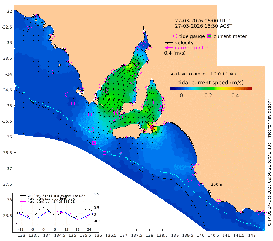 1cm/s 78T +10cm/s rms + 5cm/s 114T. SAM1DS 520m 5cm/s 35T +13cm/s rms + 5cm/s -36T. SAM2CP 100m 8cm/s 14T +21cm/s rms + 18cm/s 142T. SAM3MS 168m 8cm/s 61T +22cm/s rms + 0cm/s -30T. SAM4CY 117m 0cm/s -118T +23cm/s rms + 2cm/s 99T. SAM5CB 94m 15cm/s 44T +8cm/s rms + 3cm/s -172T. SAM6IS 83m 4cm/s 22T +11cm/s rms + 7cm/s 150T. SAM7DS 519m 22cm/s 24T +10cm/s rms + 2cm/s 87T. SAM8SG 47m 17cm/s 12T +20cm/s rms + 12cm/s -168T. NRSKAI 101m 14cm Warrnambool 12cm Port Fairy 11cm Portland 9cm Port Macdonnell 10cm Beachport 10cm Cape Rabelais (off) 9cm Robe 8cm Cape Jaffa 10cm Kingston 12cm Victor Harbor 13cm Vivonne Bay -1cm Kingscote -6cm American River 7cm Penneshaw -2cm Cape Jervis -7cm Second Valley -7cm Port Noarlunga -6cm Port Stanvac -10cm Brighton -8cm Glenelg -9cm Port Adelaide (Outer Harbor) -25cm Angus Inlet (Garden Island) -10cm Ardrossan -9cm Port Vincent 2cm Port Giles 10cm Stenhouse Bay 7cm Althorpe Island 5cm Pondalowie Bay 8cm Point Turton 5cm Port Victoria 4cm Cape Elizabeth -1cm Tiparra Reef Light -17cm Wallaroo -15cm Middle Bank -55cm Port Broughton -66cm Port Pirie -65cm Red Cliff Point (Beacon 5) -55cm Port Bonython -52cm Whyalla -45cm Western Shoal Beacon -8cm Franklin Harbor 14cm Franklin Harbor Entrance Beacon 18cm Arno Bay 24cm Port Neill 20cm Cape Hardy 22cm Tumby Bay 18cm Reevesby Island 22cm Port Lincoln 18cm Taylors Landing 7cm Whalers Bay 11cm Wedge Island Mooring 9cm Shelf Edge Mooring 12cm Coffin Bay Entrance Beacon 12cm Greenly Island 11cm Elliston 7cm Pearson Island 5cm Venus Bay 14cm Blanche Port (Streaky Bay) 15cm Thevenard 11cm St Francis Island