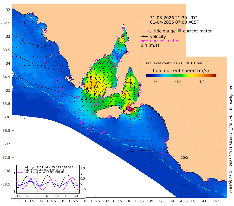0cm/s 70T +10cm/s rms + 5cm/s 114T. SAM1DS 520m 5cm/s -135T +13cm/s rms + 5cm/s -36T. SAM2CP 100m 5cm/s -131T +21cm/s rms + 18cm/s 142T. SAM3MS 168m 2cm/s -127T +22cm/s rms + 0cm/s -30T. SAM4CY 117m 2cm/s 132T +23cm/s rms + 2cm/s 99T. SAM5CB 94m 15cm/s -129T +8cm/s rms + 3cm/s -172T. SAM6IS 83m 3cm/s -119T +11cm/s rms + 7cm/s 150T. SAM7DS 519m 20cm/s -146T +10cm/s rms + 2cm/s 87T. SAM8SG 47m 16cm/s -165T +20cm/s rms + 12cm/s -168T. NRSKAI 101m -14cm Warrnambool -15cm Port Fairy -16cm Portland -19cm Port Macdonnell -18cm Beachport -20cm Cape Rabelais (off) -21cm Robe -24cm Cape Jaffa -25cm Kingston -25cm Victor Harbor -23cm Vivonne Bay -1cm Kingscote -1cm American River -14cm Penneshaw -1cm Cape Jervis 10cm Second Valley 13cm Port Noarlunga 14cm Port Stanvac 17cm Brighton 15cm Glenelg 21cm Port Adelaide (Outer Harbor) 52cm Angus Inlet (Garden Island) 23cm Ardrossan -6cm Port Vincent 0cm Port Giles -25cm Stenhouse Bay -25cm Althorpe Island -23cm Pondalowie Bay -20cm Point Turton -19cm Port Victoria -16cm Cape Elizabeth -8cm Tiparra Reef Light 17cm Wallaroo 24cm Middle Bank 26cm Port Broughton 90cm Port Pirie 100cm Red Cliff Point (Beacon 5) 88cm Port Bonython 81cm Whyalla 64cm Western Shoal Beacon 13cm Franklin Harbor -14cm Franklin Harbor Entrance Beacon -27cm Arno Bay -37cm Port Neill -40cm Cape Hardy -43cm Tumby Bay -39cm Reevesby Island -43cm Port Lincoln -37cm Taylors Landing -26cm Whalers Bay -29cm Wedge Island Mooring -23cm Shelf Edge Mooring -39cm Coffin Bay Entrance Beacon -29cm Greenly Island -41cm Elliston -38cm Pearson Island -35cm Venus Bay -66cm Blanche Port (Streaky Bay) -64cm Thevenard -52cm St Francis Island