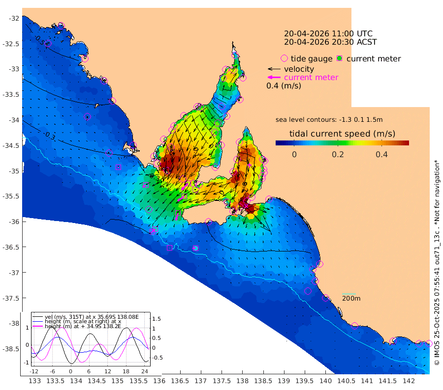 1cm/s -134T +10cm/s rms + 5cm/s 114T. SAM1DS 520m 12cm/s -130T +13cm/s rms + 5cm/s -36T. SAM2CP 100m 11cm/s -128T +21cm/s rms + 18cm/s 142T. SAM3MS 168m 9cm/s -88T +22cm/s rms + 0cm/s -30T. SAM4CY 117m 3cm/s 166T +23cm/s rms + 2cm/s 99T. SAM5CB 94m 26cm/s -126T +8cm/s rms + 3cm/s -172T. SAM6IS 83m 5cm/s -129T +11cm/s rms + 7cm/s 150T. SAM7DS 519m 29cm/s -135T +10cm/s rms + 2cm/s 87T. SAM8SG 47m 23cm/s -163T +20cm/s rms + 12cm/s -168T. NRSKAI 101m -6cm Warrnambool -6cm Port Fairy -7cm Portland -8cm Port Macdonnell -11cm Beachport -11cm Cape Rabelais (off) -12cm Robe -11cm Cape Jaffa -11cm Kingston -13cm Victor Harbor -19cm Vivonne Bay 18cm Kingscote 25cm American River 4cm Penneshaw 20cm Cape Jervis 37cm Second Valley 39cm Port Noarlunga 40cm Port Stanvac 43cm Brighton 42cm Glenelg 51cm Port Adelaide (Outer Harbor) 85cm Angus Inlet (Garden Island) 54cm Ardrossan 28cm Port Vincent 21cm Port Giles -17cm Stenhouse Bay -7cm Althorpe Island -11cm Pondalowie Bay -1cm Point Turton 1cm Port Victoria 10cm Cape Elizabeth 28cm Tiparra Reef Light 61cm Wallaroo 67cm Middle Bank 79cm Port Broughton 169cm Port Pirie 189cm Red Cliff Point (Beacon 5) 154cm Port Bonython 151cm Whyalla 136cm Western Shoal Beacon 49cm Franklin Harbor 10cm Franklin Harbor Entrance Beacon -8cm Arno Bay -18cm Port Neill -19cm Cape Hardy -26cm Tumby Bay -21cm Reevesby Island -33cm Port Lincoln -32cm Taylors Landing -8cm Whalers Bay -18cm Wedge Island Mooring -16cm Shelf Edge Mooring -27cm Coffin Bay Entrance Beacon -24cm Greenly Island -31cm Elliston -30cm Pearson Island -20cm Venus Bay -49cm Blanche Port (Streaky Bay) -51cm Thevenard -33cm St Francis Island