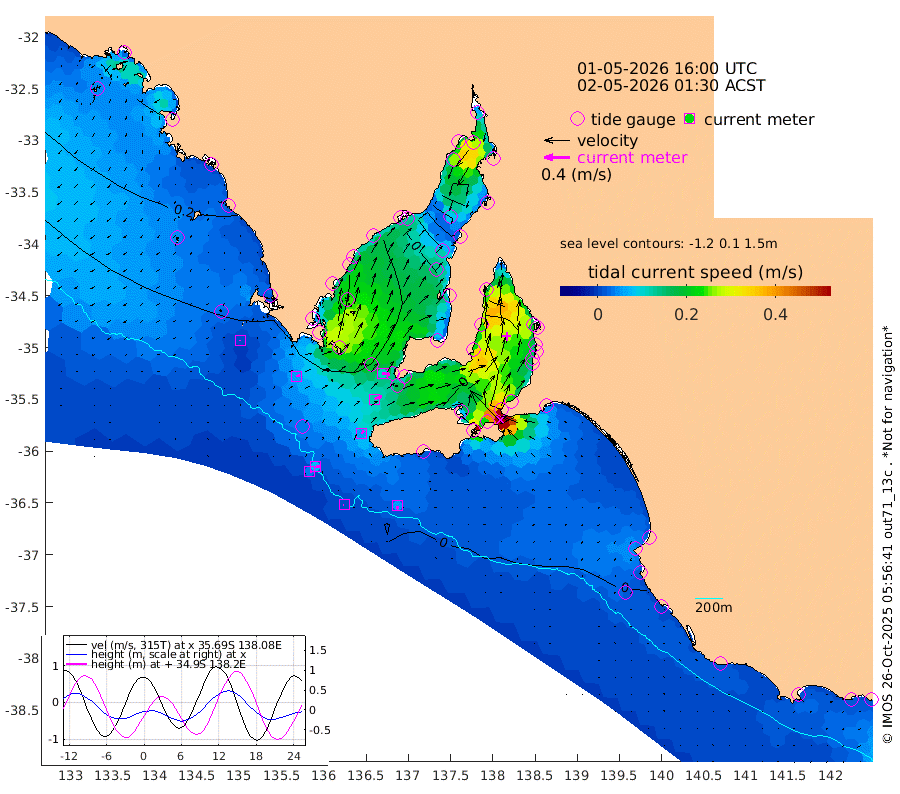 1cm/s -51T +10cm/s rms + 5cm/s 114T. SAM1DS 520m 5cm/s 74T +13cm/s rms + 5cm/s -36T. SAM2CP 100m 7cm/s 94T +21cm/s rms + 18cm/s 142T. SAM3MS 168m 5cm/s 165T +22cm/s rms + 0cm/s -30T. SAM4CY 117m 1cm/s -156T +23cm/s rms + 2cm/s 99T. SAM5CB 94m 12cm/s 65T +8cm/s rms + 3cm/s -172T. SAM6IS 83m 3cm/s 101T +11cm/s rms + 7cm/s 150T. SAM7DS 519m 11cm/s 97T +10cm/s rms + 2cm/s 87T. SAM8SG 47m 6cm/s 33T +20cm/s rms + 12cm/s -168T. NRSKAI 101m -10cm Warrnambool -9cm Port Fairy -8cm Portland -4cm Port Macdonnell -6cm Beachport -4cm Cape Rabelais (off) -2cm Robe -1cm Cape Jaffa -1cm Kingston -3cm Victor Harbor -3cm Vivonne Bay -12cm Kingscote -15cm American River -5cm Penneshaw -15cm Cape Jervis -26cm Second Valley -23cm Port Noarlunga -22cm Port Stanvac -24cm Brighton -22cm Glenelg -28cm Port Adelaide (Outer Harbor) -58cm Angus Inlet (Garden Island) -26cm Ardrossan -1cm Port Vincent -8cm Port Giles 7cm Stenhouse Bay 1cm Althorpe Island 5cm Pondalowie Bay 1cm Point Turton 4cm Port Victoria -2cm Cape Elizabeth -18cm Tiparra Reef Light -43cm Wallaroo -51cm Middle Bank -30cm Port Broughton -128cm Port Pirie -144cm Red Cliff Point (Beacon 5) -120cm Port Bonython -117cm Whyalla -104cm Western Shoal Beacon -33cm Franklin Harbor -14cm Franklin Harbor Entrance Beacon 1cm Arno Bay 10cm Port Neill 12cm Cape Hardy 15cm Tumby Bay 9cm Reevesby Island 15cm Port Lincoln 11cm Taylors Landing 6cm Whalers Bay 5cm Wedge Island Mooring -3cm Shelf Edge Mooring 9cm Coffin Bay Entrance Beacon 3cm Greenly Island 12cm Elliston 12cm Pearson Island 12cm Venus Bay 32cm Blanche Port (Streaky Bay) 29cm Thevenard 20cm St Francis Island